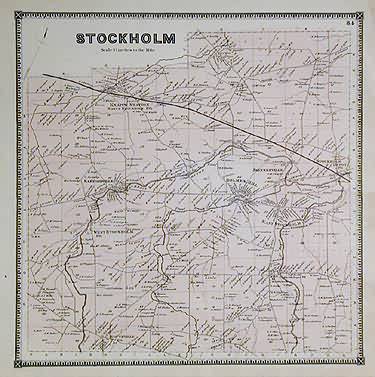 The “New Topographical Atlas of St. Lawrence County, New York” was made from the surveys of D. G. Beers, and published by Stone & Stewart in 1865. Each hand colored map illustrating a town in St. Lawrence includes abundant, historically significant details. The name of the town, streets, railroad lines, important buildings, the locations of property and the names of landowners, parks, rivers, and more relevant features are identified. This map shows Stockholm and its surroundings.
