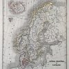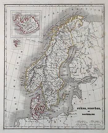 E. V. Monin made the “Atlas Universel de Geographie Ancienne & Moderne en 42 Cartes” circa 1822 in Paris. Bright colors highlight regions on these small, but detailed maps. This hand colored, French map illustrates Sweden, Norway, and Denmark with insets of Iceland and the Faroe Islands. The names of regions, important cities, mountain ranges, lakes and rivers are identified. These old maps are in very good condition with unique outline coloring.