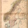 This hand colored map is from the Modern Harrow School Atlas pulblished in 1861 by Edward Stanford. Sweden, Norway and Denmark are illustrated on this beautiful map. Details include major roads, railroads, and important cities, rivers, lakes, illustrations of mountains, and notes on the area. The majority of the map is black and white while country borders, water bodies, and the names of major cities are highlighted in bright colors.