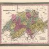 This map of Switzerland was published by Thomas, Cowperthwait and Co., in 1854. Country regions, cities, towns, bodies of water, and topographical features are illustrated on this map. Original hand coloring in muted pastels and Cowperthwaits signature sage and pink border make this map a standout from other maps made during this time. ‘