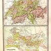 This detailed map of Switzerland and Roman Empire was printed in the “People’s Family Atlas of the World,” published in 1885. This map, which shows a great deal of topographical information, including lakes, rivers and mountains, shows the countries colored in muted pastel colors.