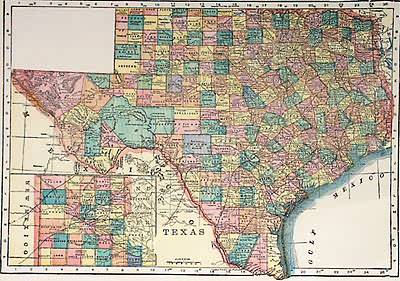 This map was produced for the “Monarch Standard Atlas” , by J.Martin Miller in 1905. Texas is illustrated on this map with a list of counties and chief cities to the right of the page. Counties are distinguished by color. An inset shows the border Texas shared with the Cheyenne and Arapahoe reservations. Other details include major roads,illustrations of lakes, rivers,national parks, and mountains. The atlas proclaimes that it offers “complete, original and authentic maps of the present developement of all the countries, empires and states of the world comprising a graphic description of the people: their civilization, their religion, their government, their cities, their important exports, their wealth, their railways, their canals, their cables, their telegraphs, ect., including a description of their climate, the productions, the rivers, the valleys, the lakes, the mountains, the minerals, the glaciers, and every other subject of interest to the american people.”