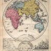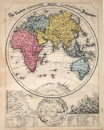 This hand colored was made for “Mitchells Modern Atlas-drawn and engraved expressly to illustrate Mitchell’s New School Geography” published in 1873. The Eastern Hemisphere is illustrated on this map, as well as the lenghts of major rivers, the heights of major mountain peaks, and the Antarctic Zone from a polar projection. Countries are distinguished by color. The names of countries, important cities, major water bodies, mountain ranges, and rivers are provided.