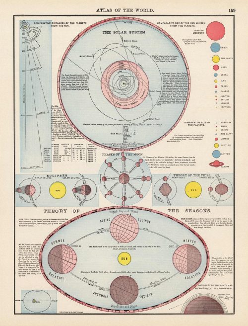 These celestial charts are from the Rand McNally Universal Atlas printed in 1895. The Theory of Tides, Theory of Seasons, explainations of eclipses and the phases of the moon are shown. Also, the size of the planets, and comparative distance of the planets from the sun, diagrams of apparent vs. refractive rays and the speed of each planets motion are given.