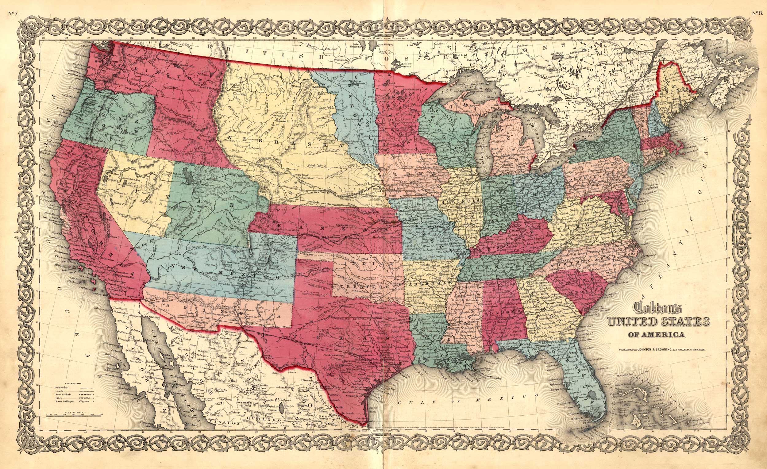 Art Source International is proud to offer this map from the 1860 edition of Coltons General Atlas. Colton atlases, especially those from the late 1850’s, have become increasingly rare. The General Atlas was the first single edition atlas published by the Colton brothers succeeding the expensive two volume Atlas of the World. These maps have the signature ‘ inch Colton border surrounding each map. The Colton firm refused to compromise quality, choosing to compete for sales in the finer quality international market rather than the cheap domestic one. Because of this, all maps were engraved by steel plates rather than by wax engraving which was the most common method used at this time. This map of the United States is very detailed with identification of counties, cities, townships, railroads, common roads, canals, creeks and rivers. This map documents a glimpse into the western borders of the United States in the 1860’s; it shows numerous exploration routes, Native American territory, and more. Each map has beautiful muted red, green, tan, pink, and yellow hand coloring.