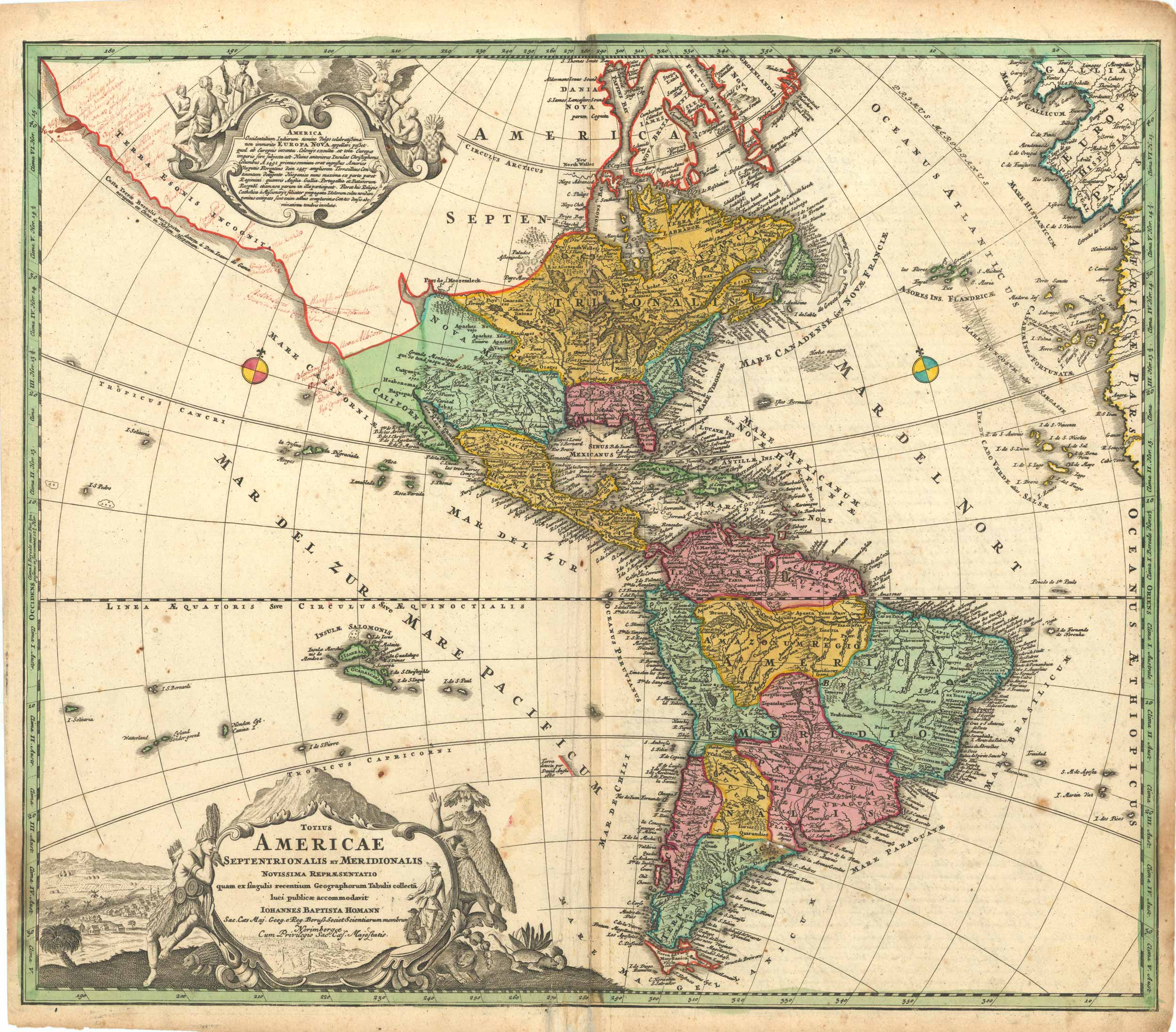 This map of the Americas, appeared in Homann’s Atlas Scholasticus. The title page of the atlas is labeled “Atlas Minor XXVI. Selectarum Tabularum Geographicum Homanni Secundum Methodum Huberni aliorumque recentorium geographorum dispositus et recognitus” – which translates as a selection of 26 geographic maps by Homann, arranged and revised according to the method of Hübner and other recent geographers. This scarce atlas, referred to as a Kleiner (meaning small/minor) atlas, included 26 selected maps by Homann, guided by Johann Hubner. This atlas also included a copper engraved, hand-colored title page as frontispiece from the Atlas Novus Terrarum Orbis Imperia by M. Rössler. Based on research, this atlas was most likely compiled between 1720 – 1737.