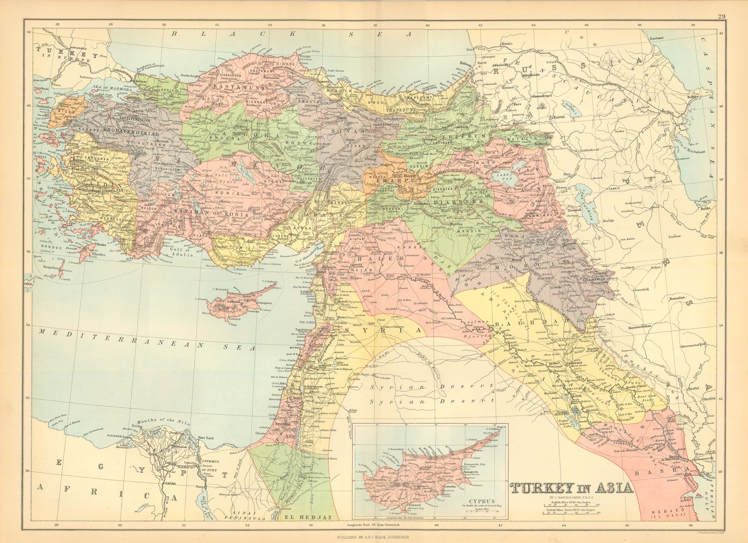 This beautiful map of Turkey in Asia was printed in Edinburgh by Adam and Charles Black for “Black’s General Atlas of the World,” published in 1885. Details include identification of regions, important cities, railroads, major roads, rivers, lakes, and mountains. This map is in excellent condition with bright, crisp color, and is printed on heavier paper stock then is customary on maps from this period. Also included is an inset map of the island of Cyprus.