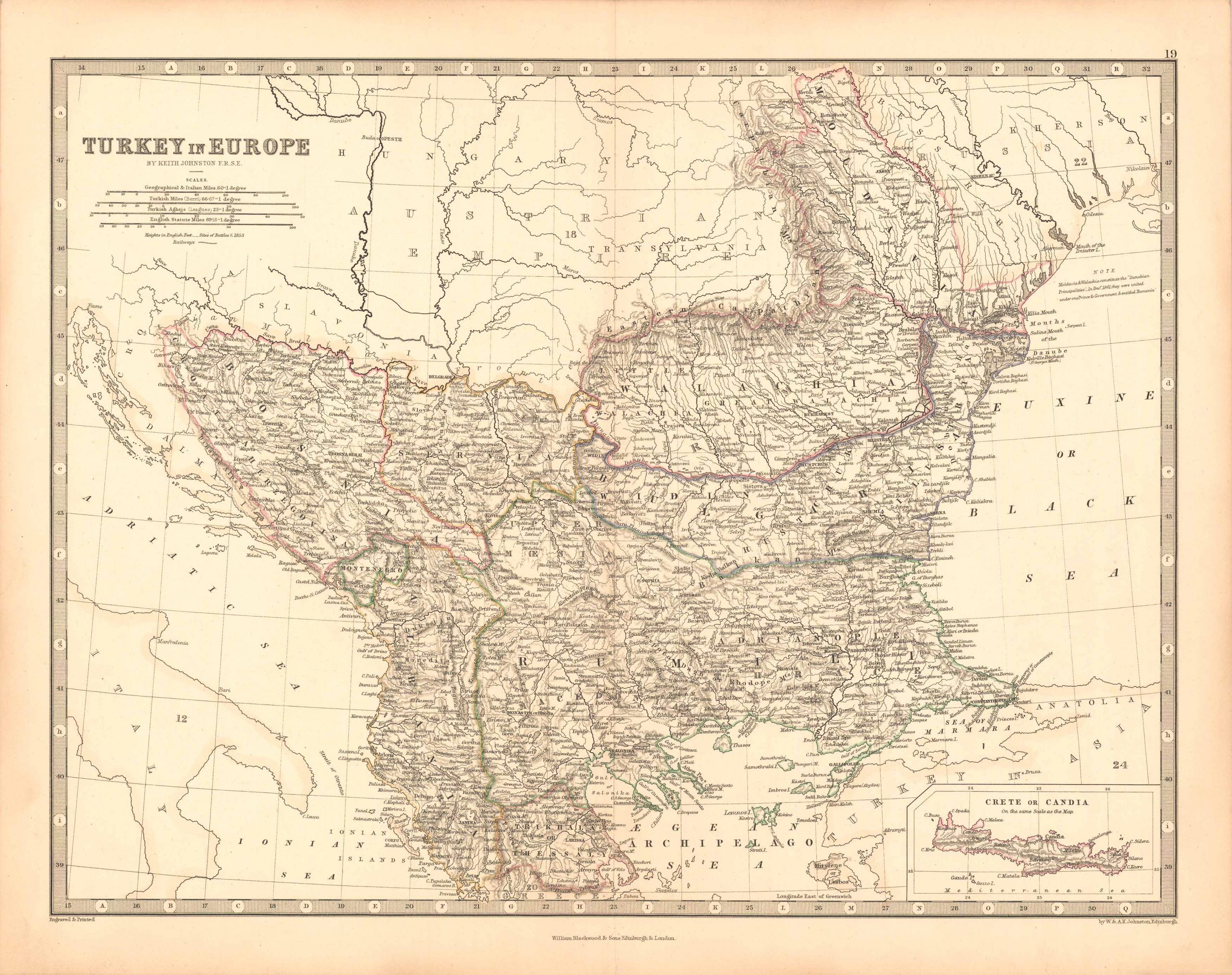 Alexander Keith Johnston took the title Geographer at Edinburgh to the Queen when he began map-making in Scotland in 1826. Johnston, famous for his attention to geographic detail, made this rare edition of the “Handy Royal Atlas of Modern Geography” in 1868. Turkey in Europe divided by departments is illustrated on this hand colored map. Details include an inset map of Crete or Candia, the names of regions, rivers, lakes, mountains, important cities, and state borders. Each large scale map was printed on thick paper with vibrant color highlighting borders.