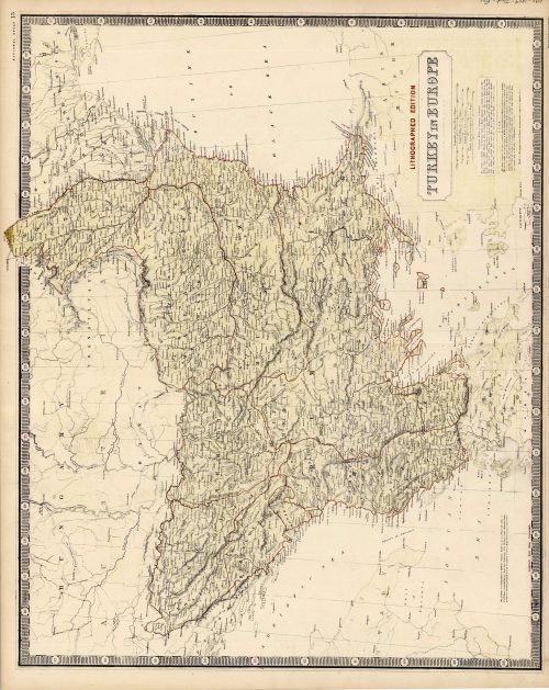 This hand colored map was made by Alexander Keith Johnston for “The National Atlas of Historical, Commercial, and Political Geography”. This very rare lithographed edition was printed in Edinburgh in 1849. Turkey in Europe is illustrated on this map. The boarders of regions are distinguished by dark color and countries are pastel yellow on this mostly black and white map. Other details include the names of regions and important cities, and illustrations of mountains, lakes, rivers, and major roads.