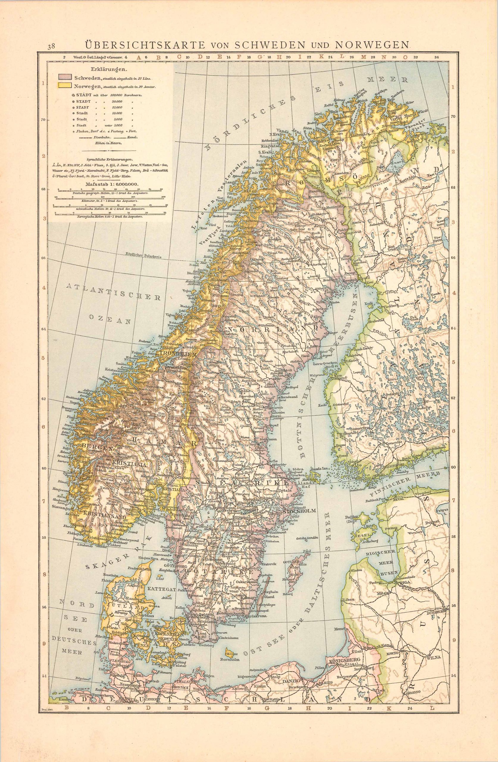 This wonderful map was published by Dr. Richard Andrees in 1887, in Leipzig Germany. German-made maps of this time period were known for their attention to detail and their fine engraving work. This map of Sweden and Norway is the epitome of fine German printing.