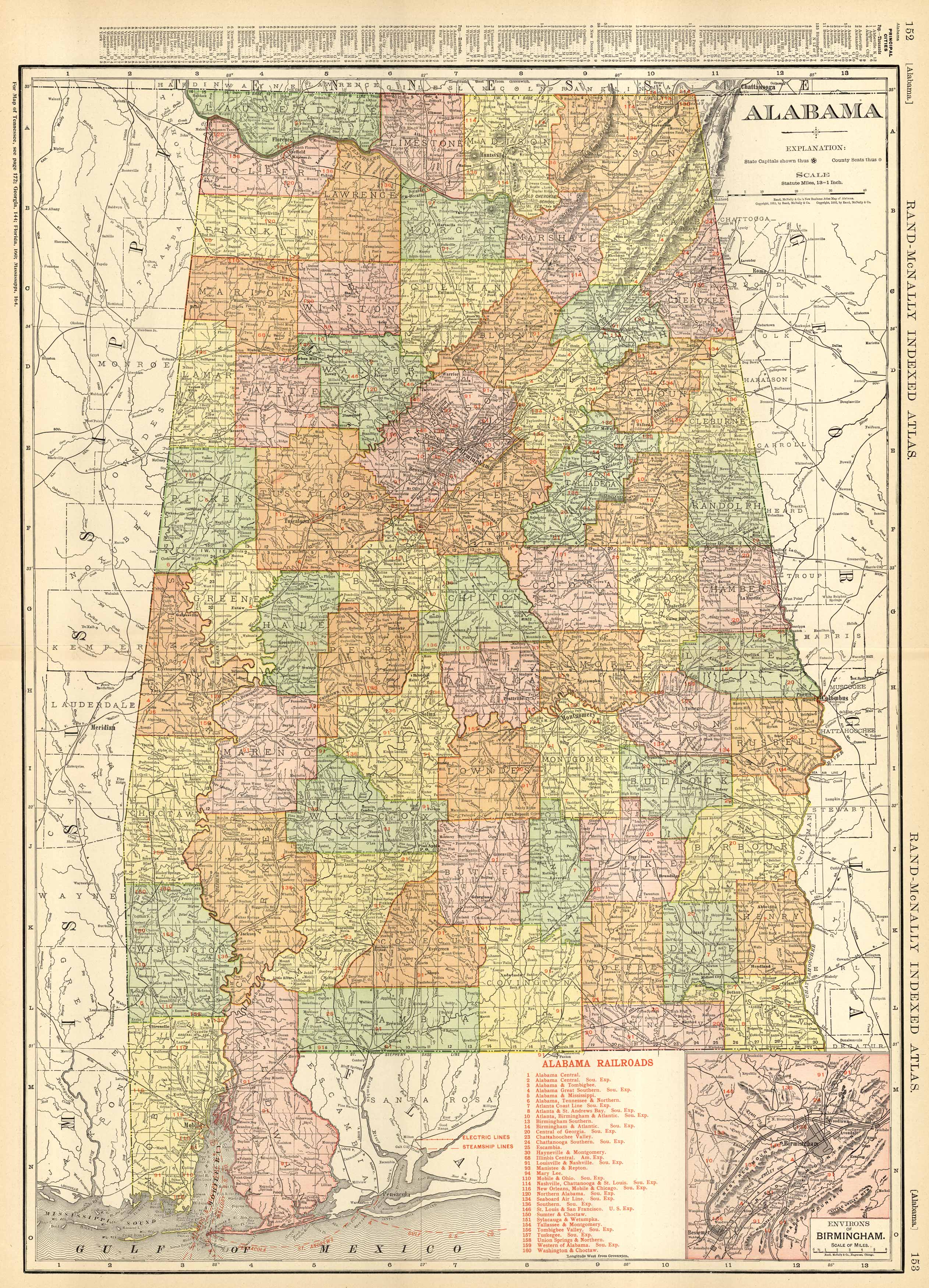 This map of Alabama was produced by Rand McNally and Co. as part of its Commercial Atlas of America. These maps are some of our favorite maps because of the large size of each map sheet (25.5”x20.5”). The detail shown on each map is exceptional because of the map size. These maps were intended to be used by business for shipping and other uses. Roads, railroads, and rivers are clearly shown. There is more detail on these maps than any others during this time period.