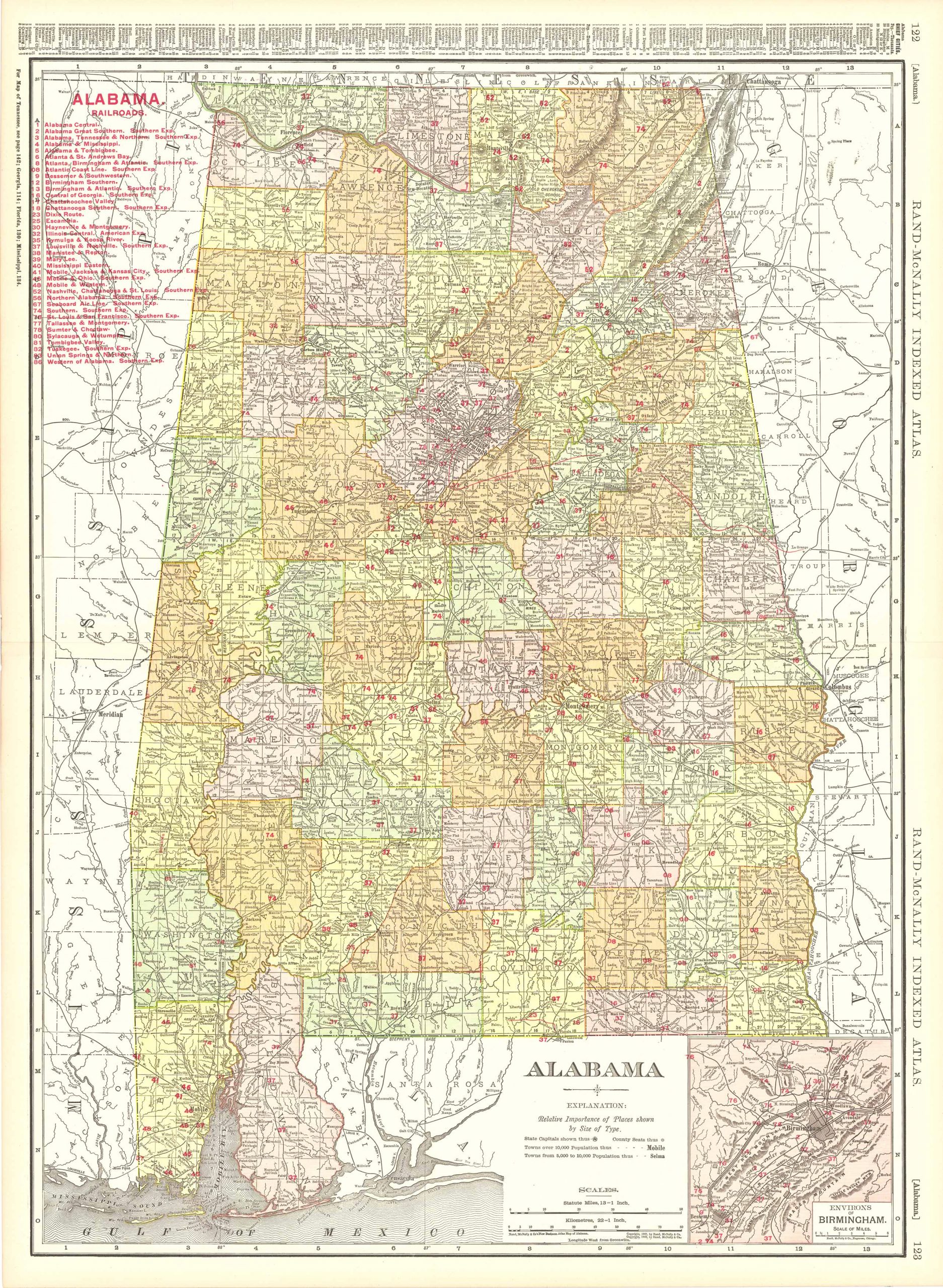 We are proud to offer this wonderful large scale map of Alabama originally issued as part of Rand McNally’s Enlarged Business Atlas and Shippers Guide in 1907. The maps from this atlas were larger than most atlas’ published at the time and show many more cities and towns. All railroad lines were drawn in red and numbered with a listing of all railroads operating in the state on each map. William H. Rand founded the company in 1856 and incorporated it in 1873 with his partner Andrew McNally. They published their first atlas, The Business Atlas, in 1877. Rand McNally and Company is the oldest business of it’s kind in the country.