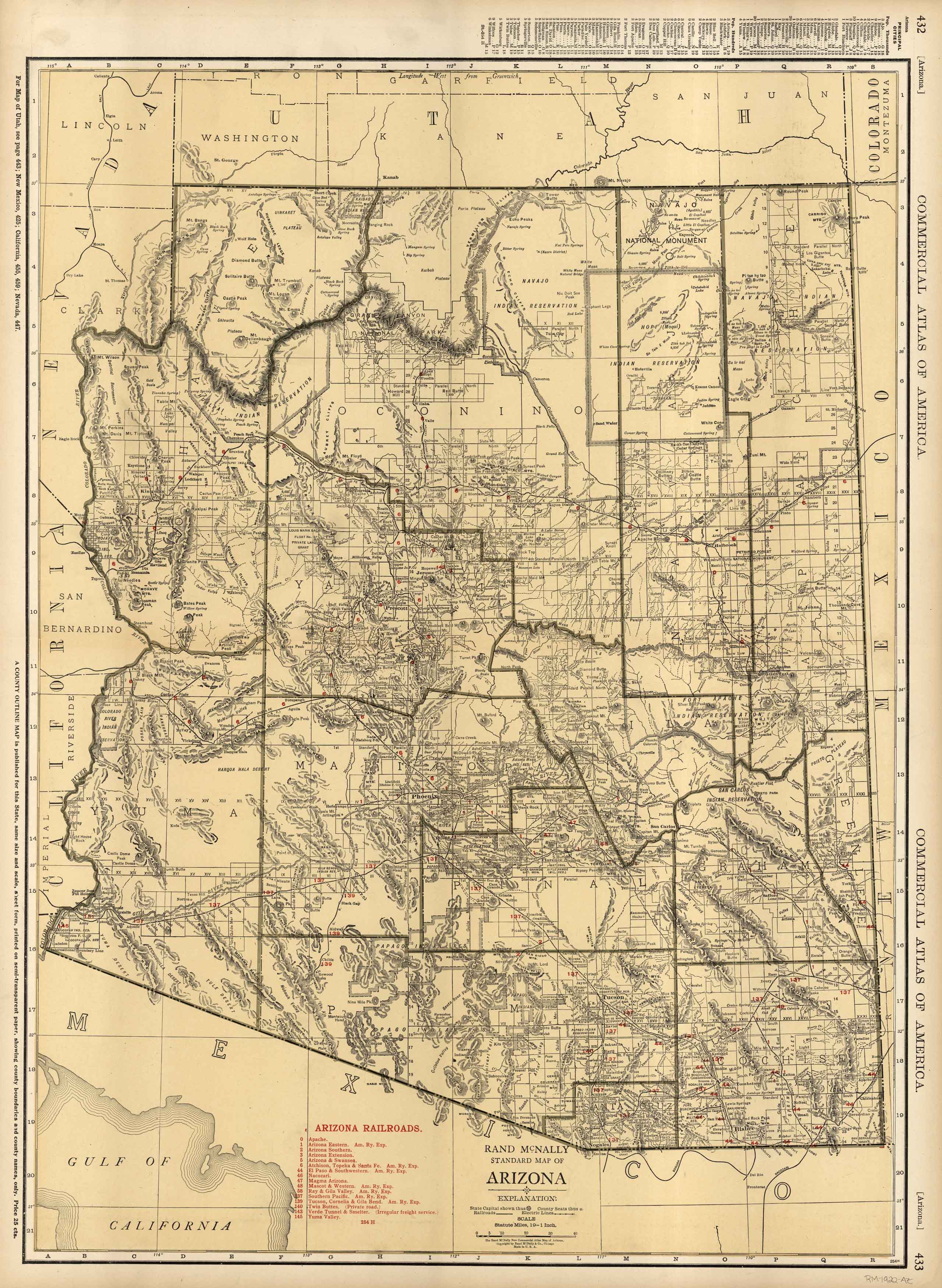 This map of Arizona was produced by Rand McNally and Co. as part of its Commercial Atlas of America. The detail shown on each map is exceptional because of the map size. These maps were intended to be used by business for shipping, etc. Roads, railroads, and rivers are clearly shown. There is more detail on these maps than any others during this time period.