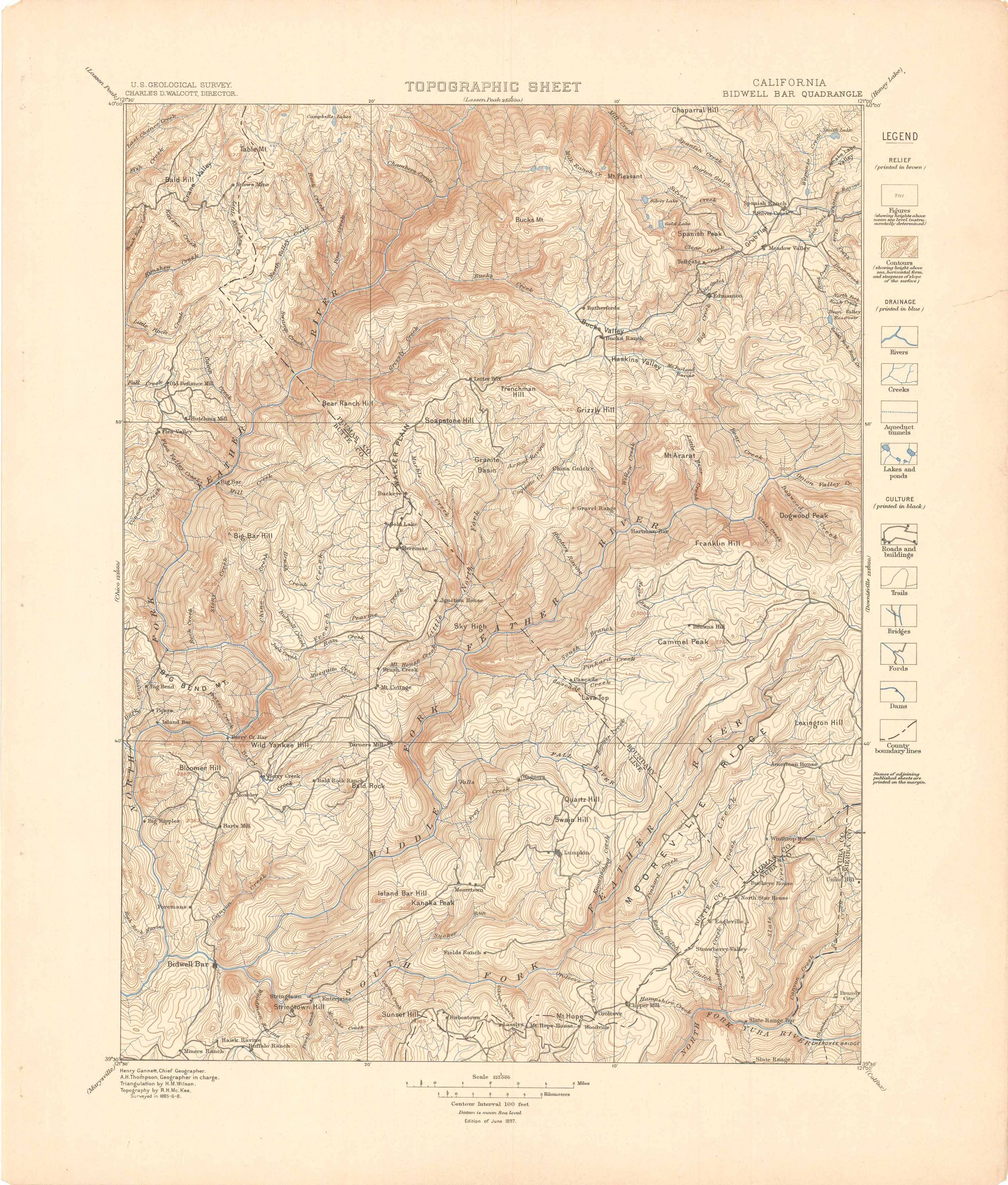 This detailed map of Bidwell Bar Quadrangle, California is an edition of June 1897 by the United States Geological Survey. The United States Geological Survey publishes topographic maps of the entire United States. These maps are often used as the basis for other commercial map products and they serve as one of the best tools available for navigating the country’s wild and urban terrain. This map shows contour lines (lines of equal elevation) which depict natural features of the land, as well as streams, trails, forest types, roads and other man-made natural features. This Topographic quadrangle map is published at a scale of 1:125,000. It has become more difficult over the years to find these older publication dates.
