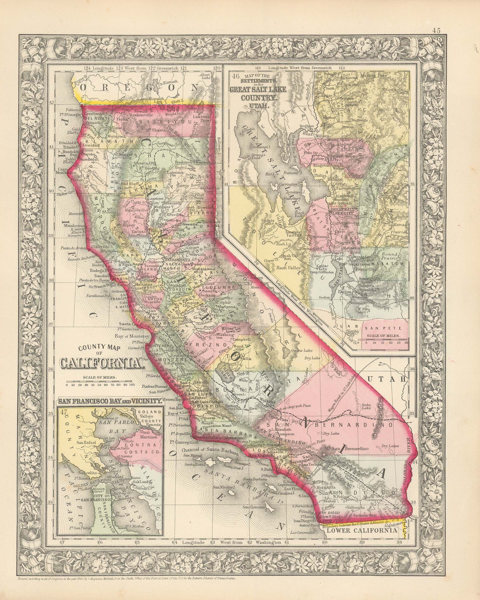 In 1860 S. Augustus Mitchell Jr. took over his father’s map publishing business and in that year he started publishing Mitchell’s New General Atlas. Editions of the new general were issued annually until 1887. Mitchell Jr. continued publishing this atlas until 1879. The editions from 1880 to 1887 were published by Wm. M. Bradley. This map published in 1865 is a wonderful example of Mitchell’s map-making prowess with beautiful original hand-coloring.