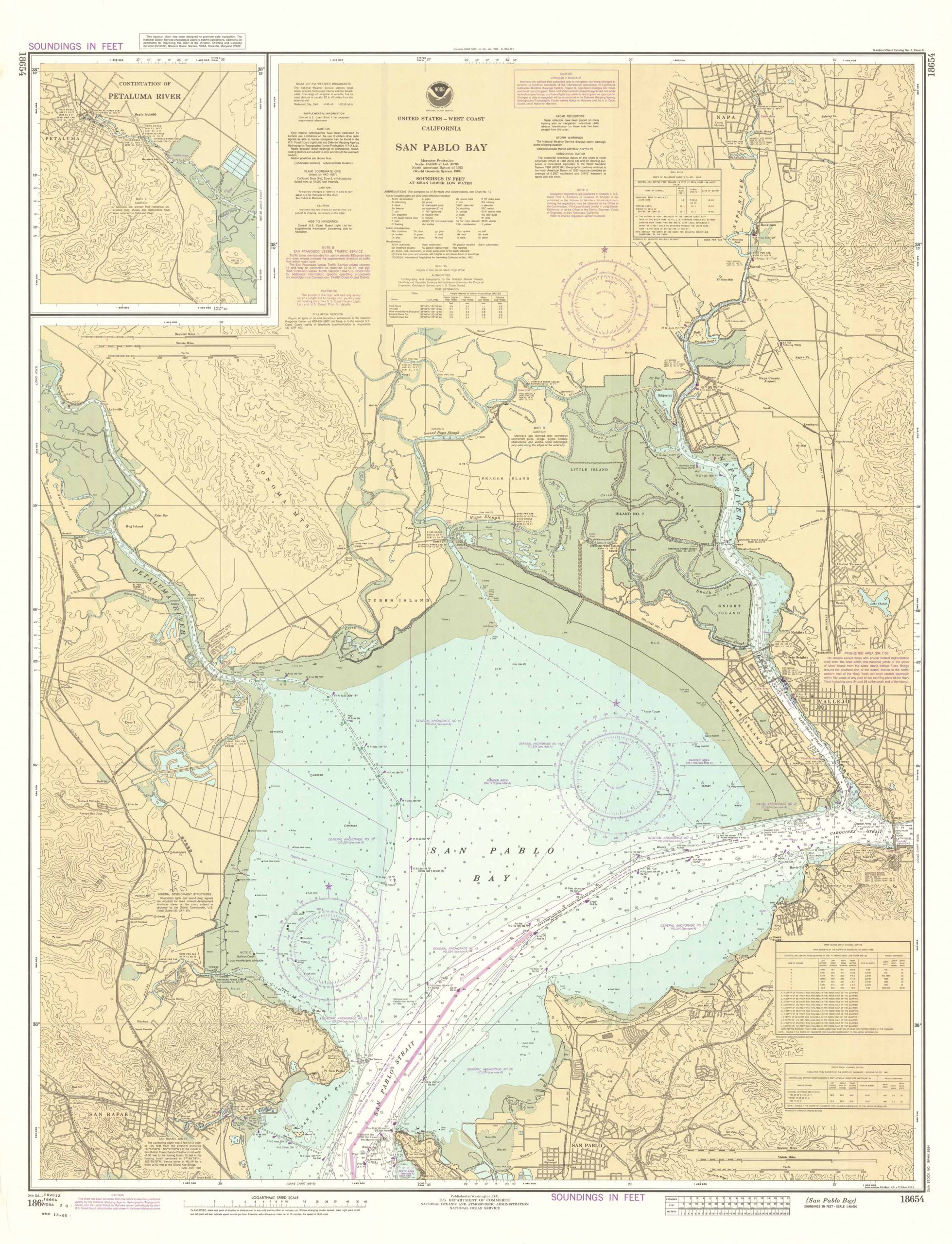 Large map of San Pablo Bay, California, created by NOAA – the National Oceanic and Atmospheric Administration. This map is set to a scale of 1:40,000 and includes Soundings in Feet at Mean Lower Low Water, an inset of the Continuation of the Petaluma River, chart of Mare Island Strait Channel Depths, Pinole Shoal Channel Depths, a Logarithmic Speed Scale, Tidal Information chart, Heights, and Notes.