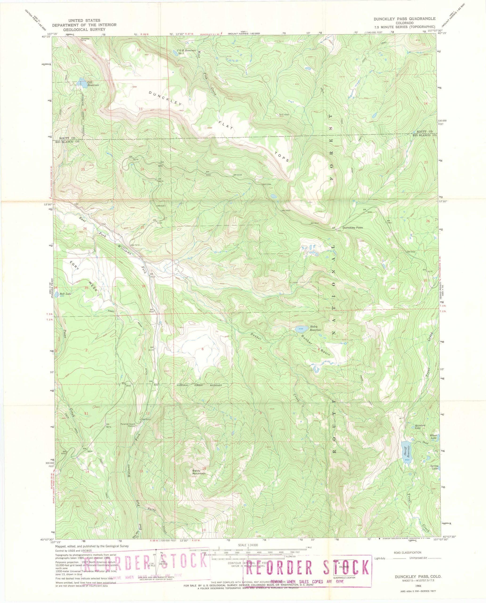 This detailed map of Dunckley Pass, Colorado was created in 1966 by the United States Geological Survey, as part of the 7.5 minute series. The United States Geological Survey publishes topographic maps of the entire united states. These maps are often used as the basis for other commercial map products and they serve as one of the best tools available for navigating the country’s wild and urban terrain. This map shows contour lines (lines of equal elevation) which depict natural features of the land, as well as streams, roads, trails, forest types, buildings, and other natural man-made features. This 7.5 minute quadrangle map is published at a scale of 1:24,000. It has become more difficult over the years to find these older publication dates.