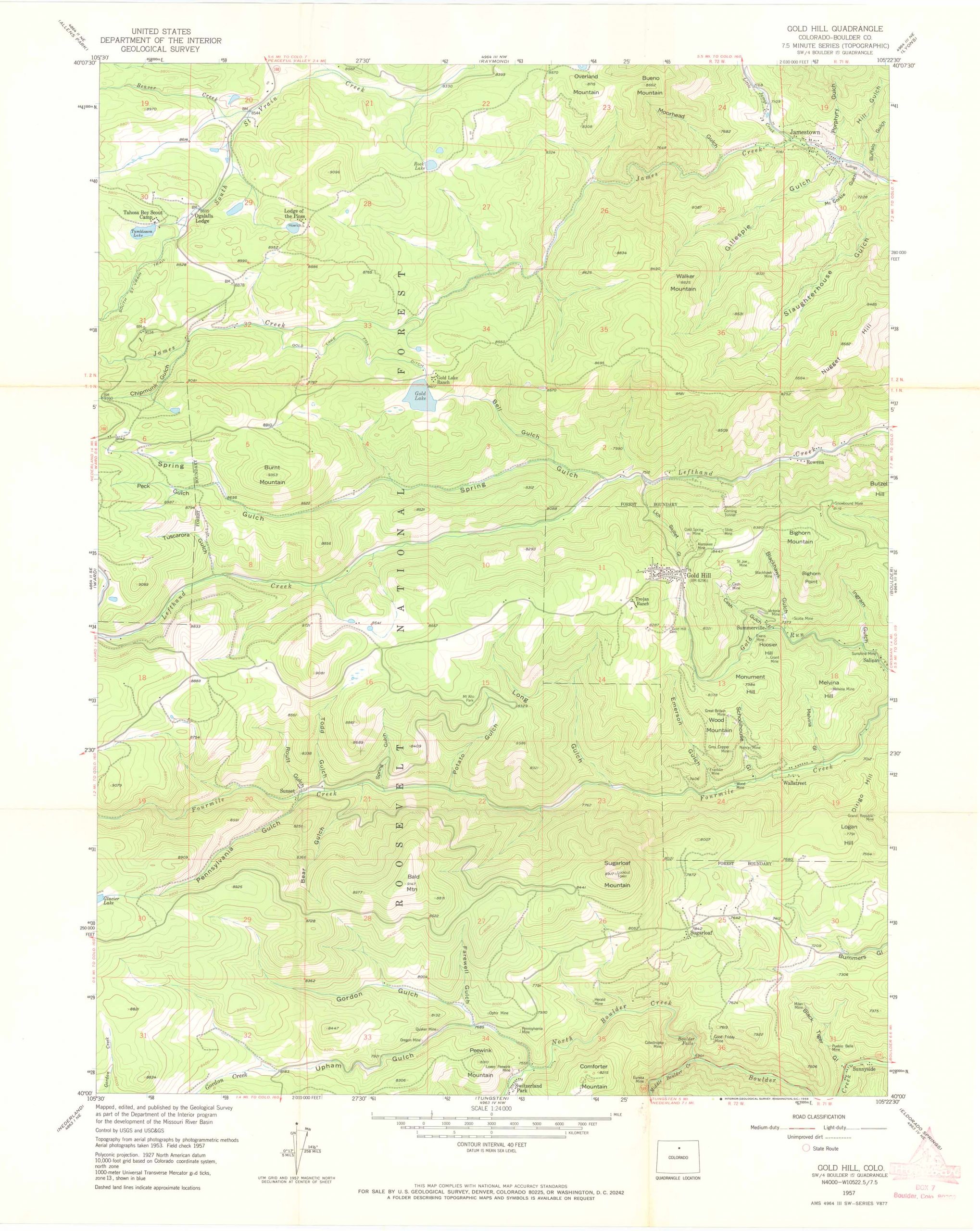 This detailed map of Gold Hill, Colorado was created in 1957 by the United States Geological Survey as part of the 7.5 minute series. The United States Geological Survey publishes topographic maps of the entire united states. These maps are often used as the basis for other commercial map products and they serve as one of the best tools available for navigating the country’s wild and urban terrain. This map shows contour lines (lines of equal elevation) which depict natural features of the land, as well as streams, roads, trails, forest types, buildings, and other natural man-made features. This map is published at a scale of 1:24,000. It has become more difficult over the years to find these older publication dates.