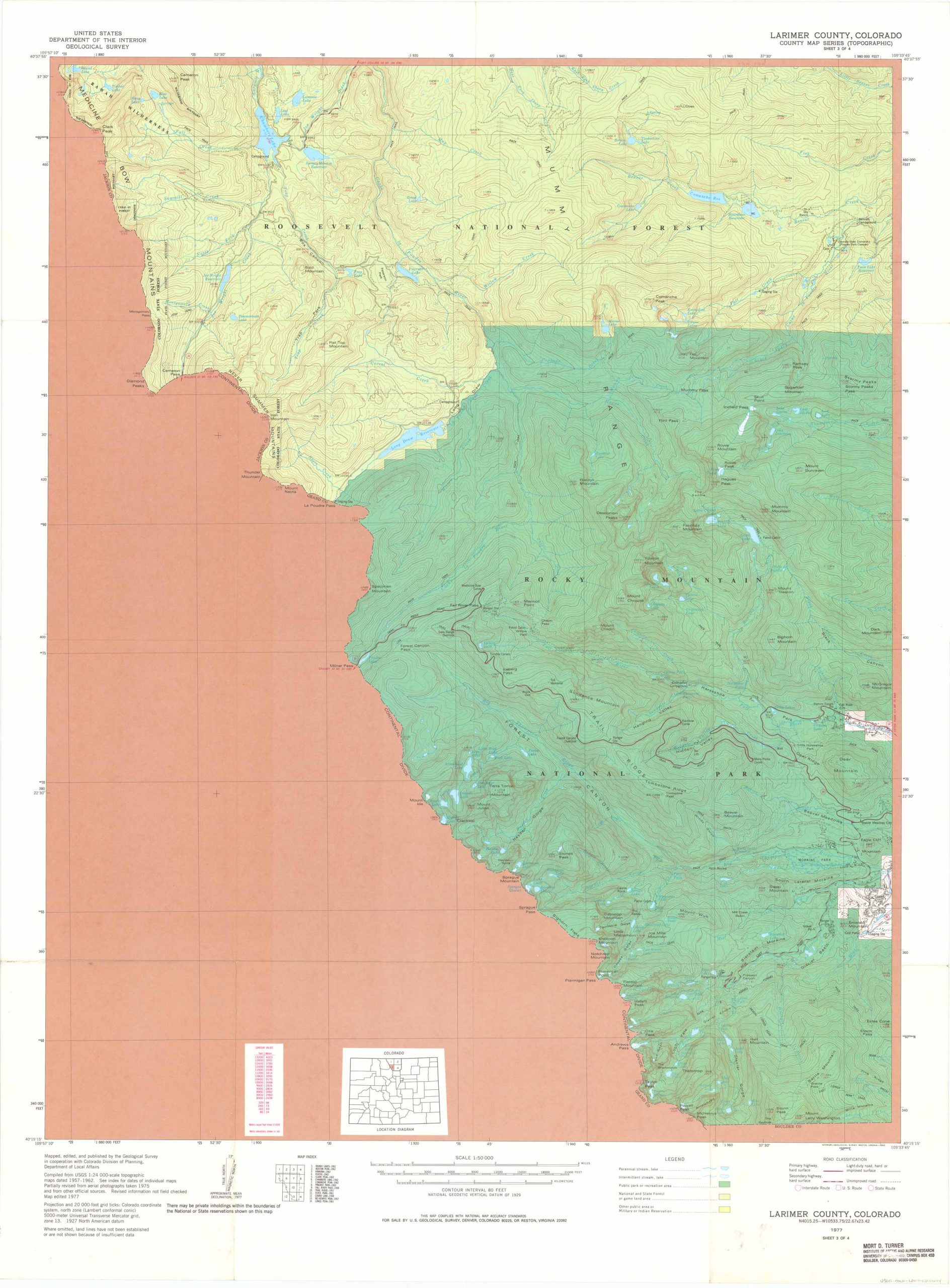 This map of Larimer County, Colorado was created in 1977 by the United States Geological Survey, as part of the county map series. The United States Geological Survey publishes topographic maps of the entire united states. These maps are often used as the basis for other commercial map products and they serve as one of the best tools available for navigating the country’s wild and urban terrain. This map shows contour lines (lines of equal elevation) which depict natural features of the land, as well as streams, roads, trails, buildings, forest types, and other natural man-made features. This county map is published at a scale of 1:50,000. It has become more difficult over the years to find these older publication dates.