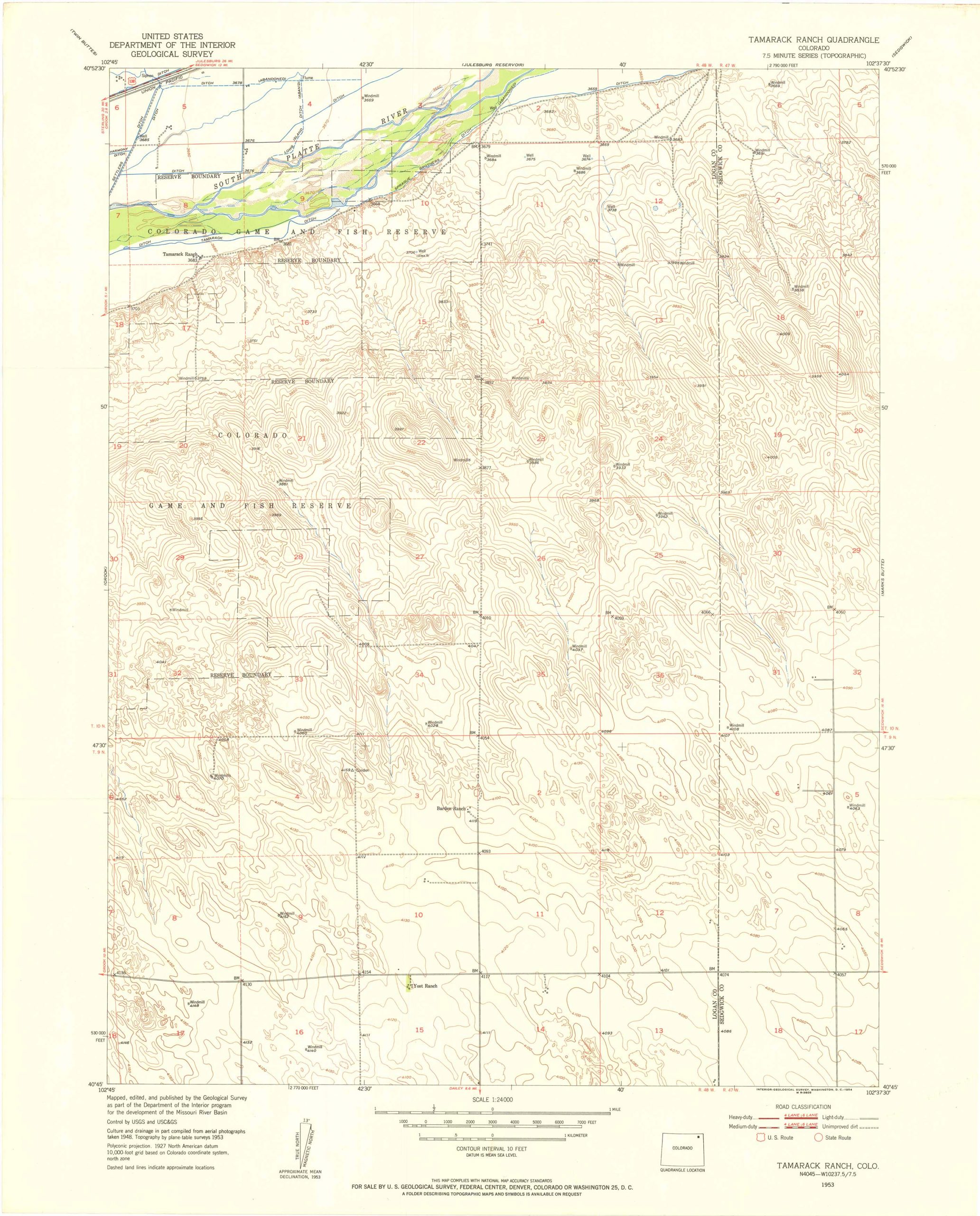 This detailed map of Tamarack Ranch Quadrangle, Colorado was created in 1953 by the United States Geological Survey as part of the 7.5 minute series. The United States Geological Survey publishes topographic maps of the entire united states. These maps are often used as the basis for other commercial map products and they serve as one of the best tools available for navigating the country’s wild and urban terrain. This map shows contour lines (lines of equal elevation) which depict natural features of the land, as well as streams, trails, forest types, roads and other man-made natural features. This 7.5 minute quadrangle map is published at a scale of 1:24,000. It has become more difficult over the years to find these older publication dates.