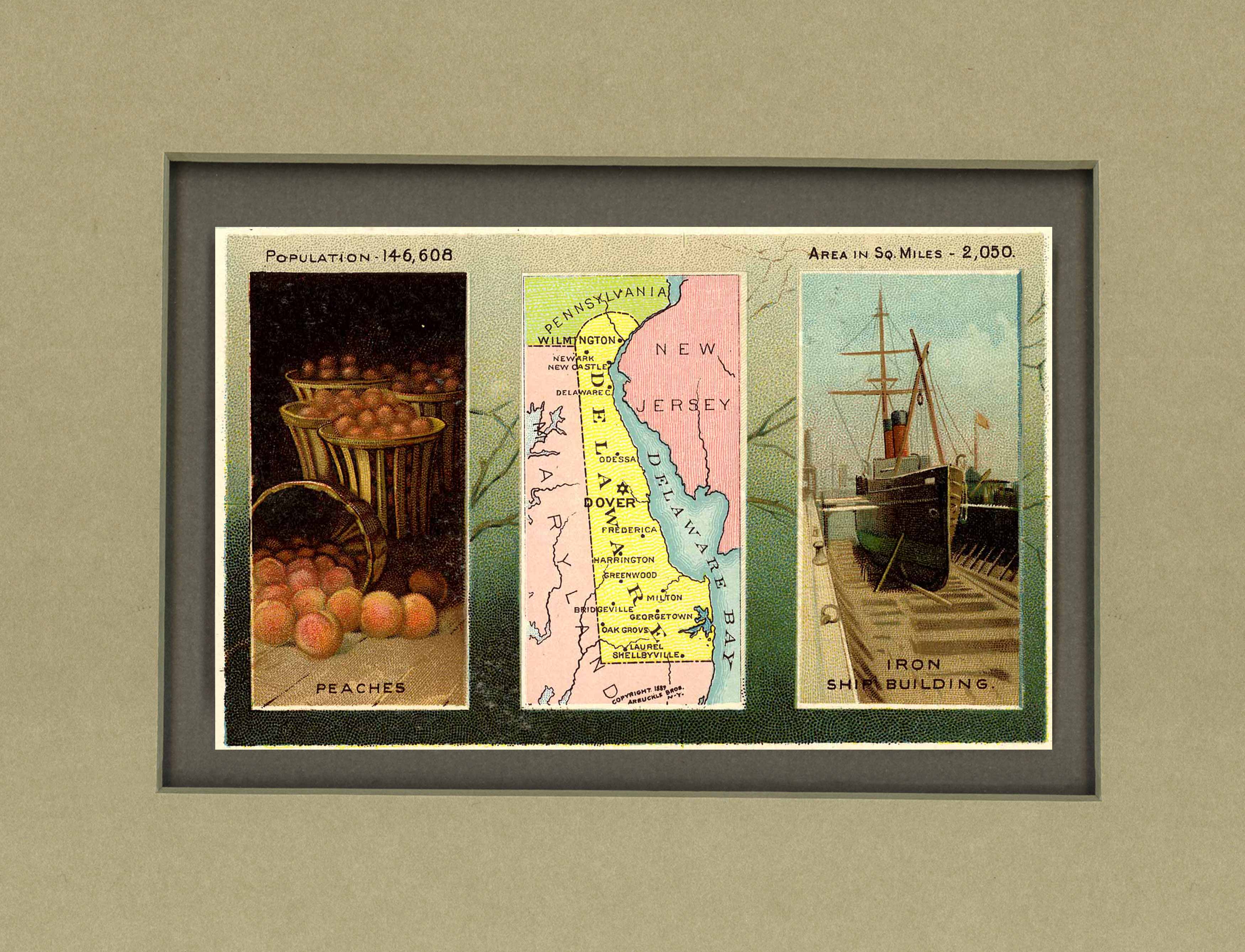 Founded in the 1860s, the Arbuckle Coffee Company grew and expanded with 19th century America. It was a staple the cowboys carried with them on the trail, and a commodity commonly found in American homes at the time. The Arbuckle Company made a unique advertising effort in the late 1880’s and began to enclose small decorative trade cards in their packages of coffee. The front of the card contained a colorful image of children, flowers, sports or even a map, while the back of the card had their advertising and some descriptive information. Later these trade cards became so collectible that the company focused on their success and issued them separately as premiums. These charming map cards illustrate beautifully the history and character the lands. Each map shows lakes and rivers, cities and towns, forts, the population, and area in square miles. Each card measures 3 1/4″ x 5 1/4″. The matted size is 8 x 10 inches.