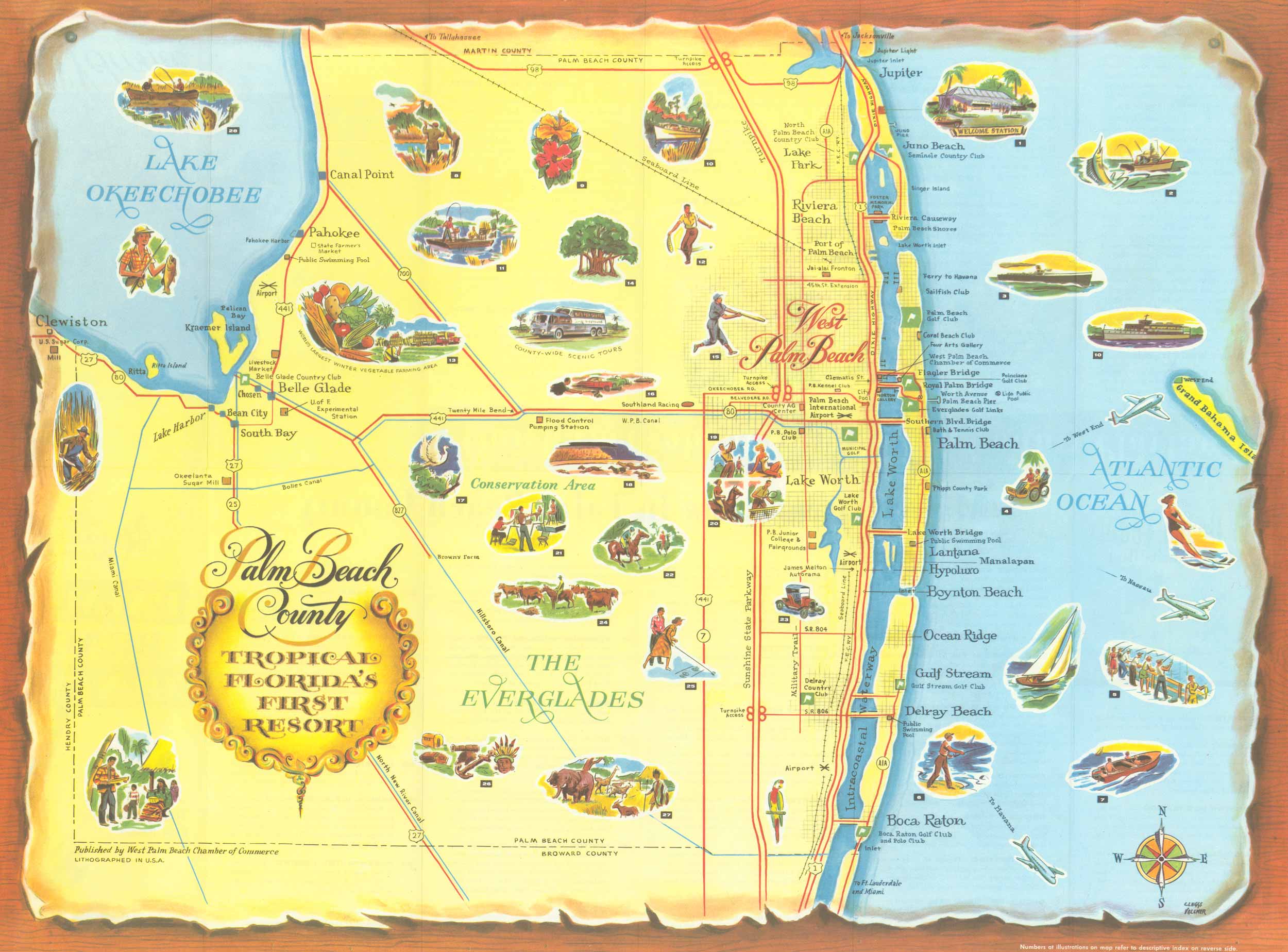 1960 Pictorial Map of Palm Beach Florida, “Tropical Florida’s First Resort.” The map shows roads, canals, and the Intercoastal Waterway as well as points of interest such as beaches, country clubs, and golf clubs. Throughout the map, there are illustrations showing recreational activities and tourist attractions. Published by West Palm Beach Chamber of Commerce.