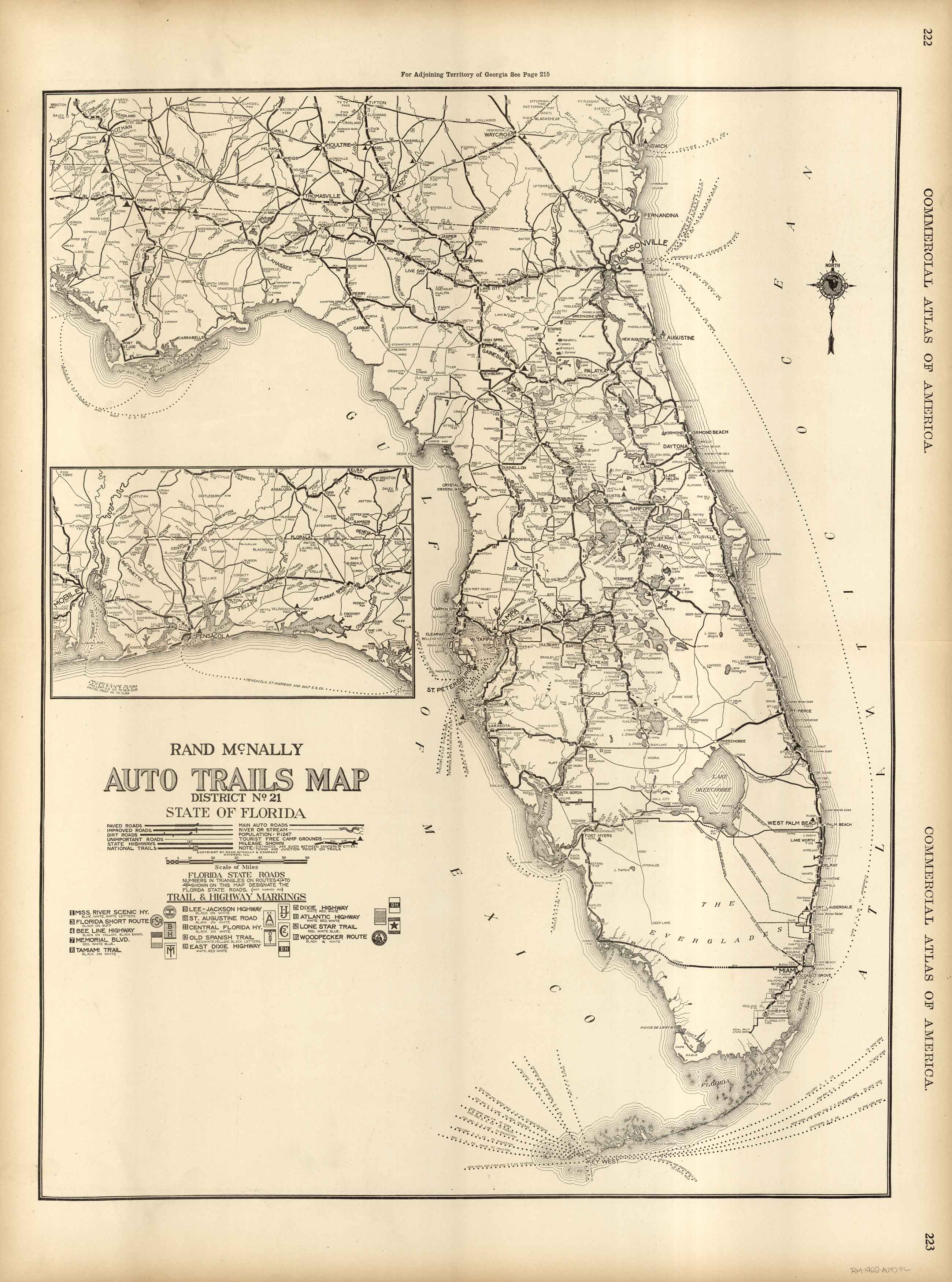 This map of Florida was produced by Rand McNally and Co. as part of its Commercial Atlas of America. The detail shown on each map is exceptional because of the map size. These maps were intended to be used by business for shipping, etc. Roads, railroads, and rivers are clearly shown. There is more detail on these maps than any others during this time period.