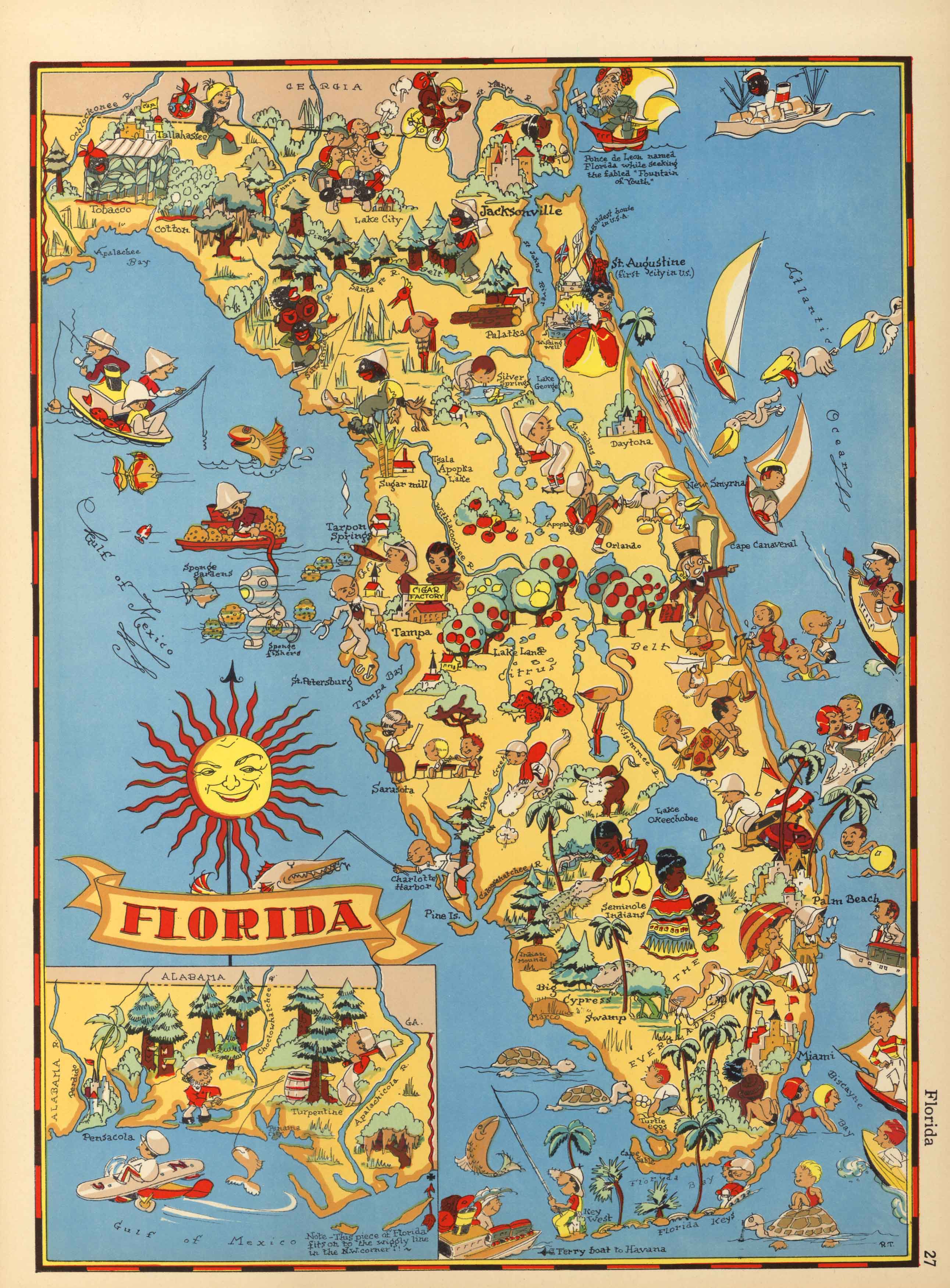 This charming antique pictorial map was published in 1935 by the famous mapmaker & illustrator, Ruth Taylor (White). These illustrated maps came from the atlas, “Our U.S.A – A Gay Geography,” with text by Frank Taylor & the maps done by Ruth Taylor. Ruth Taylors maps have become increasingly rare. Her whimsical maps are bold, colorful, and full of life; showing the local feel, cultural stereotypes, industries and activities of the area. These maps have become very difficult to find and would be a great addition to any map collection.