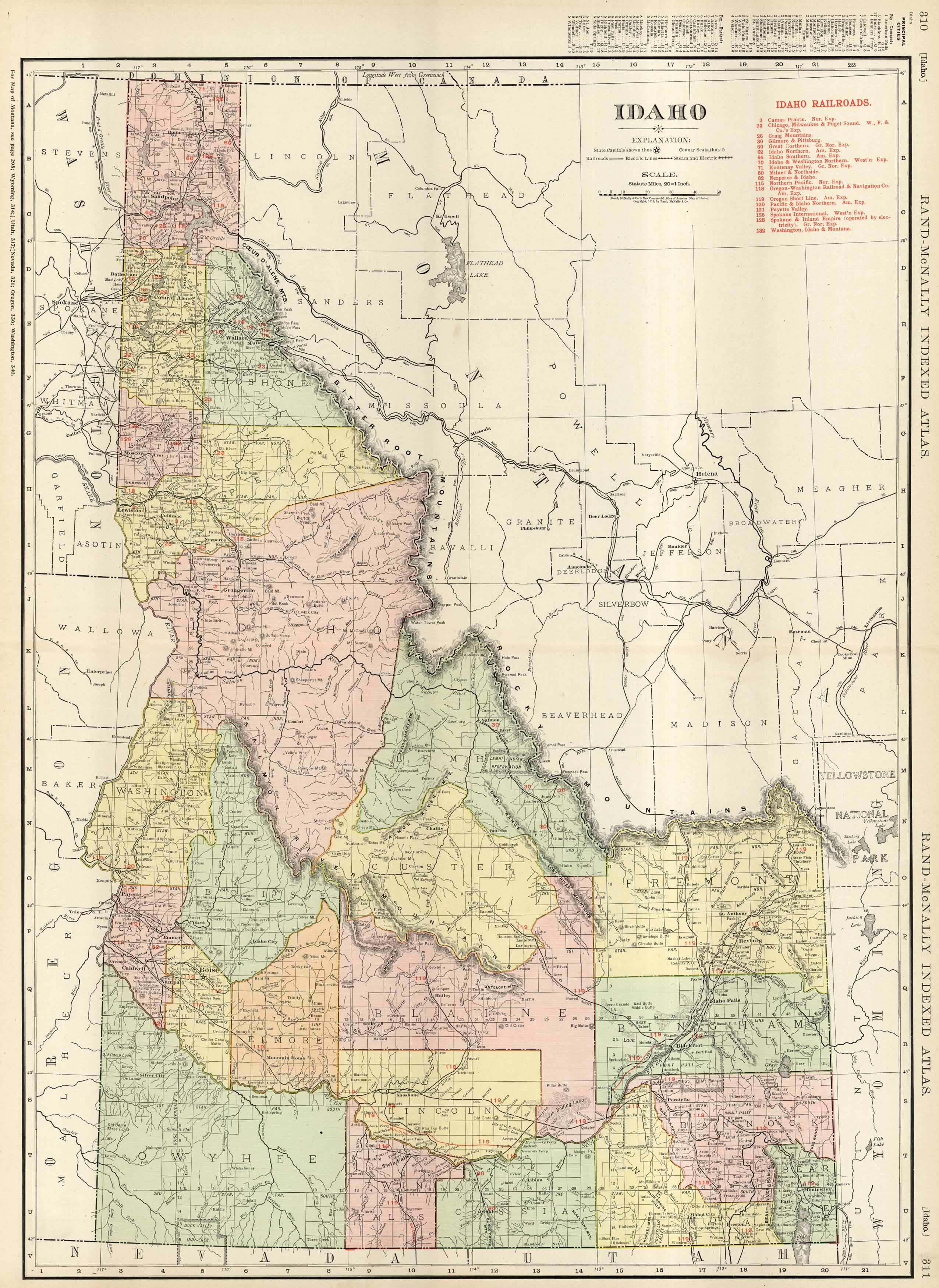 This map of Idaho was produced by Rand McNally and Co. as part of its Commercial Atlas of America. These maps are some of our favorite maps because of the large size of each map sheet (25.5”x20.5”). The detail shown on each map is exceptional because of the map size. These maps were intended to be used by business for shipping and other uses. Roads, railroads, and rivers are clearly shown. There is more detail on these maps than any others during this time period.