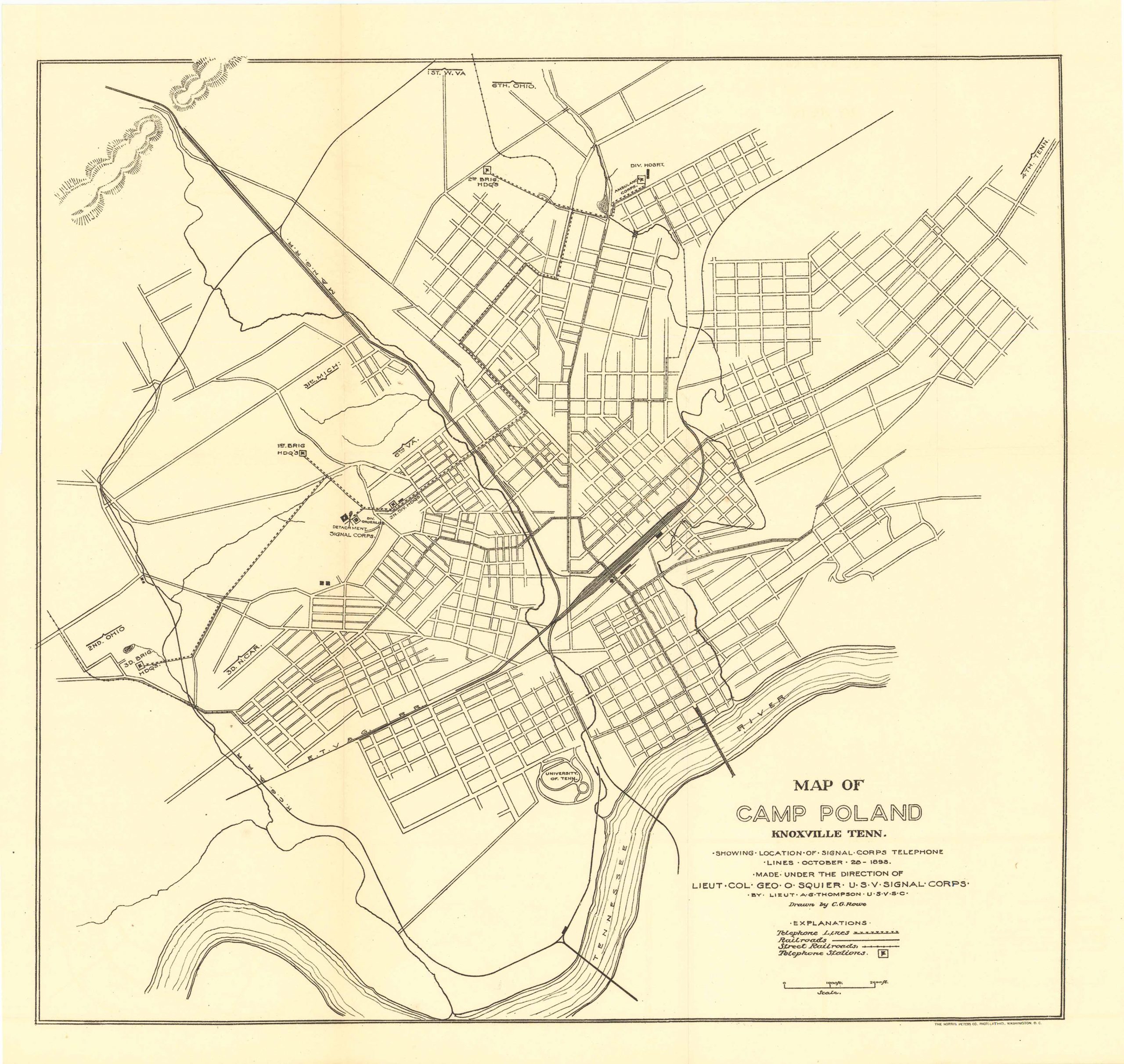Map of Camp Poland Knoxville, Tennessee. Showing the location of signal corps telephone lines, October 28th, 1898. Made under the direction of Lieutenant Col. Geo. O. Squier, U.S.V Signal Corps and drawn by C.G. Rowe. This map comes with explanations as well as markers of: 1st Brigade Headquarters, 2nd Brigade Headquarters, the University of Tennessee and more.