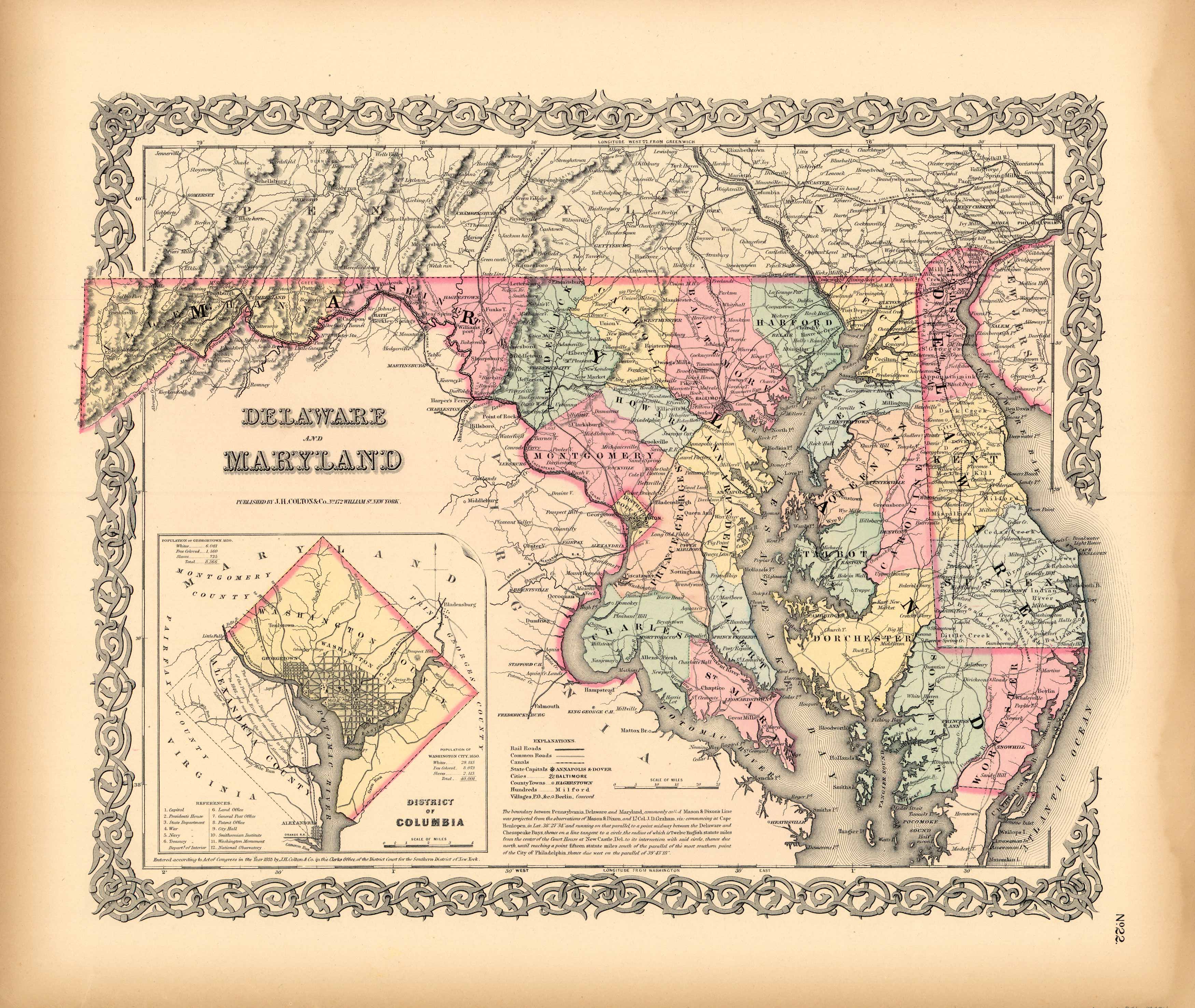 Art Source International is proud to offer this map of Delaware and Maryland from the 1856 edition of Coltons Atlas of the World. Colton atlases, especially those from the 1850’s, have become increasingly rare. The Colton maps were engraved by steel plates rather than by wax engraving, which was the most common method used at this time. These maps are very detailed in beautiful hand colored pastels, and feature Colton’s signature 3/4 inch border. This map shows cities, towns and villages, transportation routes, common roads, canals, rivers and lakes, and other geographical features. ‘