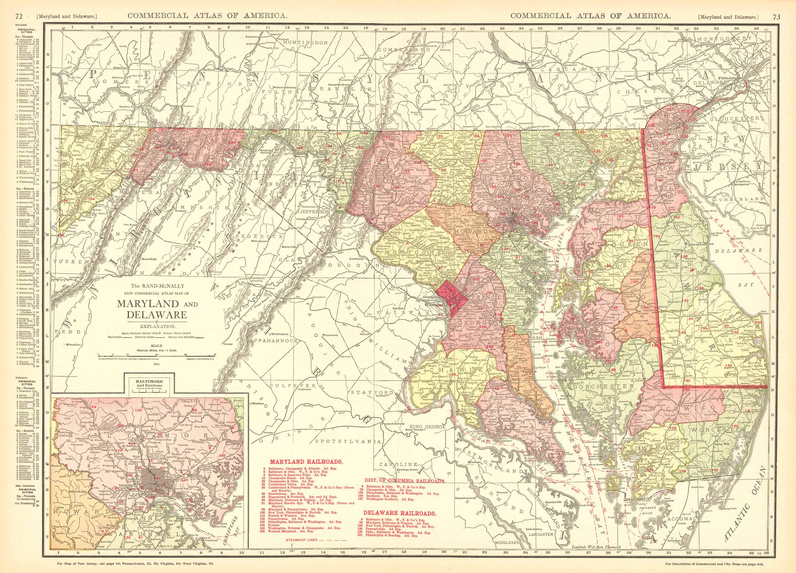 This map of Maryland and Delaware was produced by Rand McNally and Co. as part of its Commercial Atlas of America. These maps are some of our favorite maps because of the large size of each map. The detail shown on each map is exceptional because of the map size. These maps were intended to be used by business for shipping and other uses. Roads, railroads, rivers, and buildings are clearly shown. There is more detail on these maps than any others during this time period.