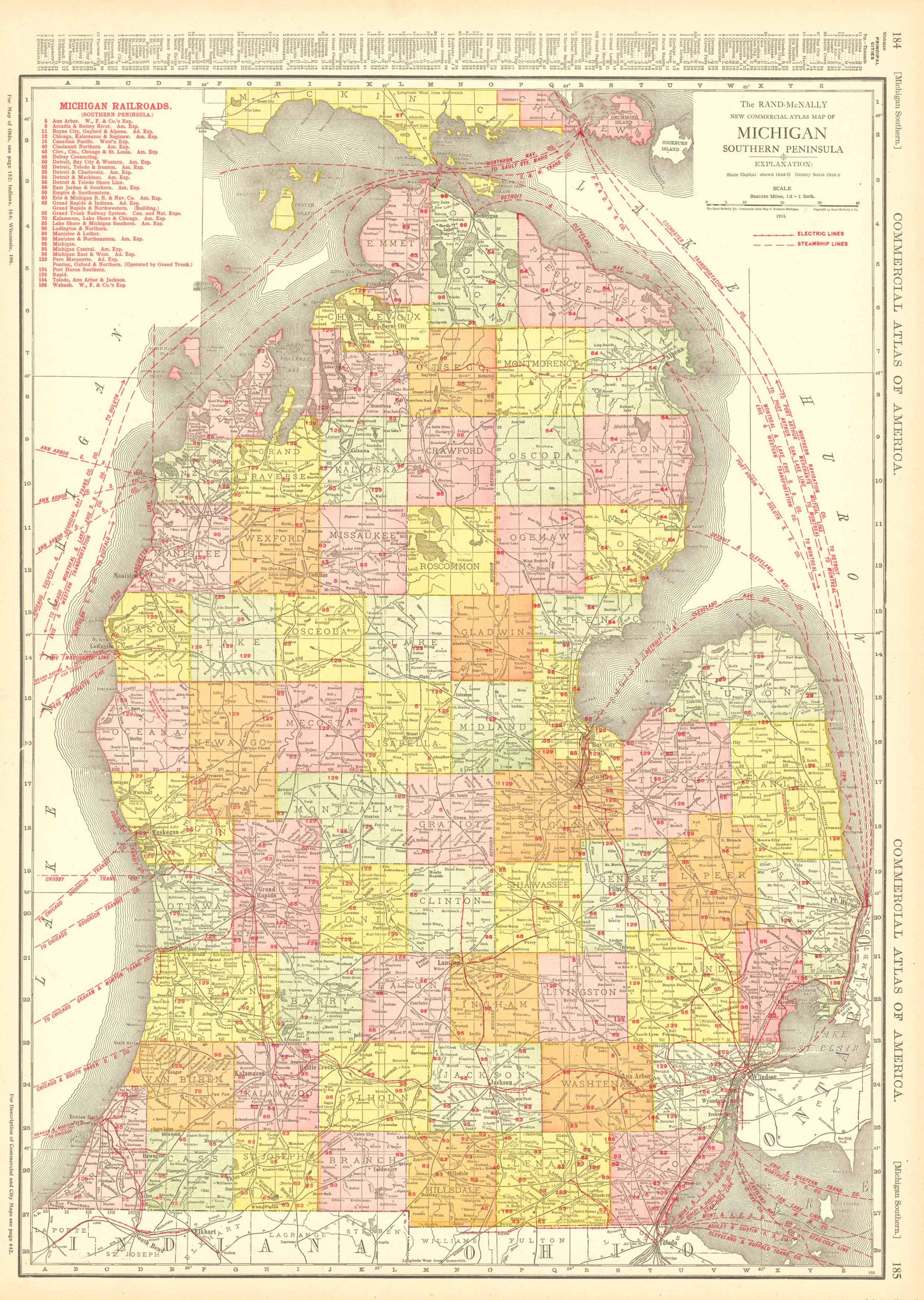 This map of Michigan was produced by Rand McNally and Co. as part of its Commercial Atlas of America. These maps are some of our favorite maps because of the large size of each map. The detail shown on each map is exceptional because of the map size. These maps were intended to be used by business for shipping and other uses. Roads, railroads, rivers, and buildings are clearly shown. There is more detail on these maps than any others during this time period.