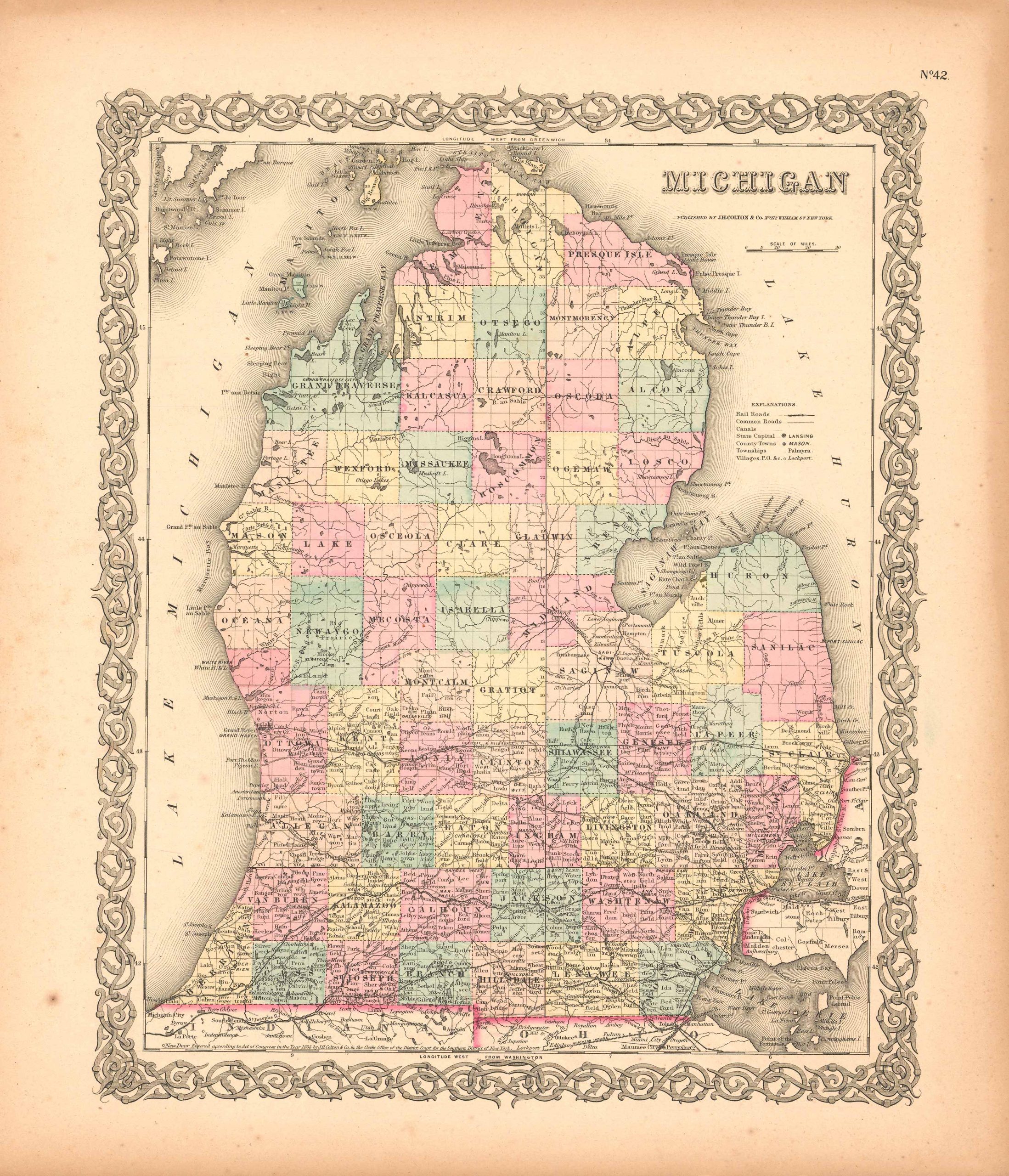 Art Source International is proud to offer this map of Michigan from the 1856 edition of Coltons Atlas of the World. Colton atlases, especially those from the 1850’s, have become increasingly rare. The Colton maps were engraved by steel plates rather than by wax engraving, which was the most common method used at this time. These maps are very detailed in beautiful hand colored pastels, and feature Colton’s signature 3/4 inch border. This map shows cities, towns and villages, transportation routes, common roads, canals, rivers and lakes, and other geographical features.