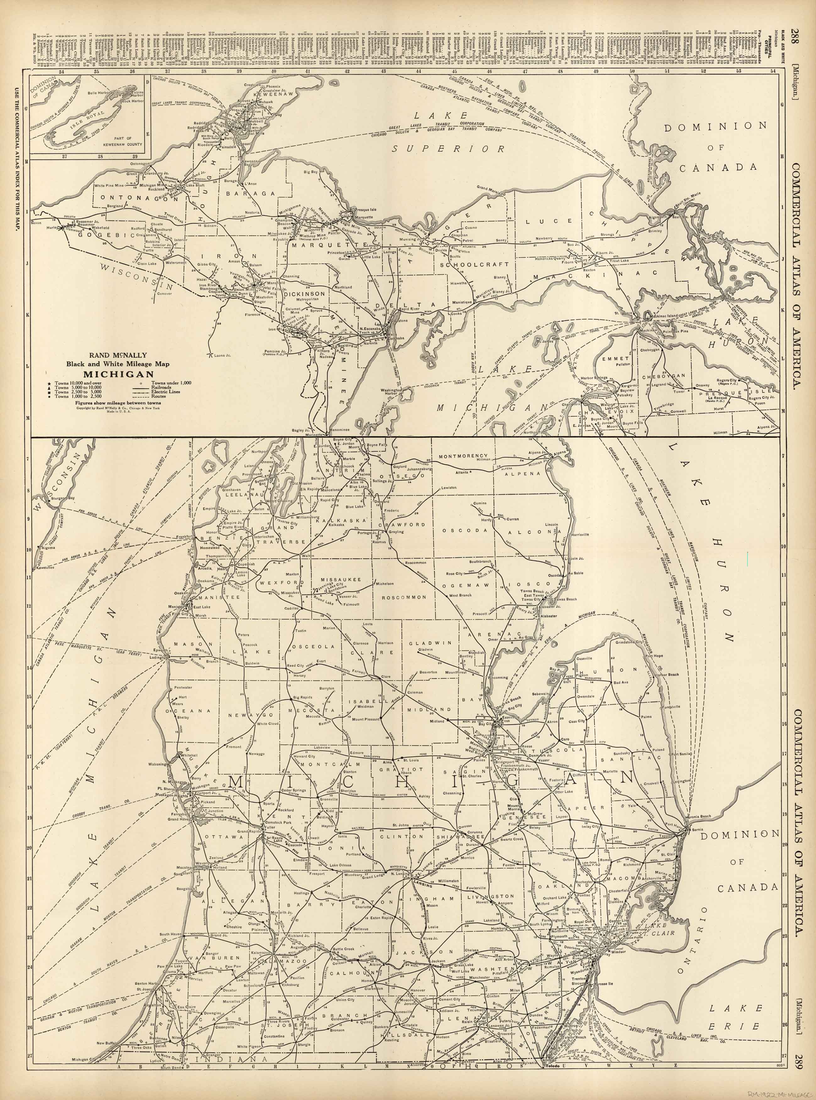 This mileage map of Michigan was produced by Rand McNally and Co. as part of its Commercial Atlas of America. The detail shown on each map is exceptional because of the map size. These maps were intended to be used by business for shipping, etc. Roads, railroads, and rivers are clearly shown. There is more detail on these maps than any others during this time period.