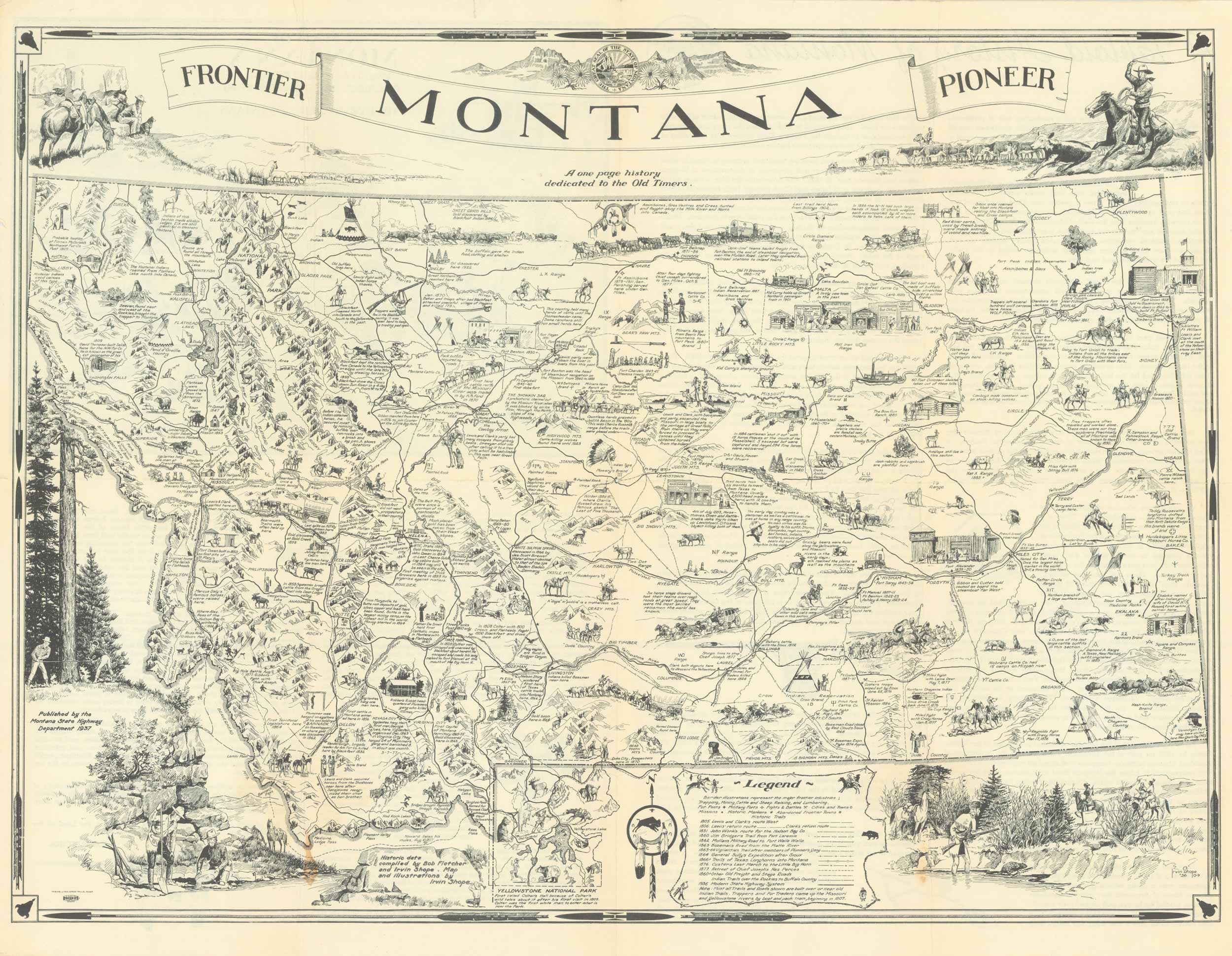 1937 pictorial map of Montana by the Montata State Highway Department, “Frontier Montana Pioneer, A One Page History Dedicated to the Old Timers.” Illustrations by Irvin Shope.