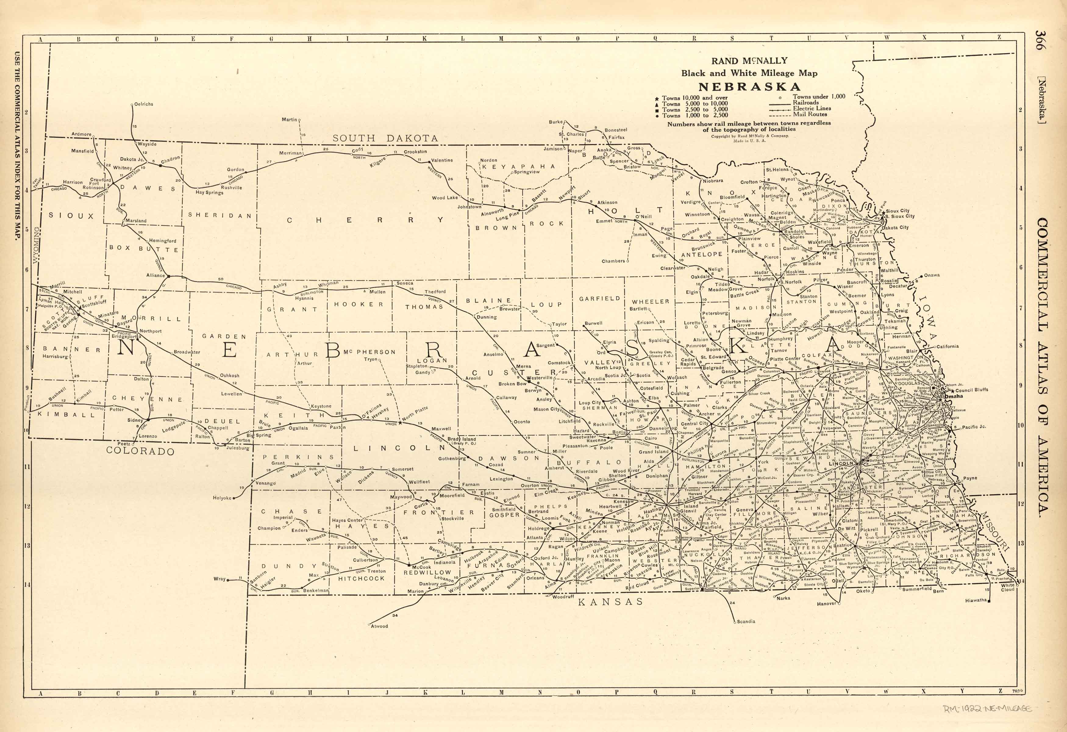 This map of Nebraska was produced by Rand McNally and Co. as part of its Commercial Atlas of America. The detail shown on each map is exceptional because of the map size. These maps were intended to be used by business for shipping, etc. Roads, railroads, and rivers are clearly shown. There is more detail on these maps than any others during this time period.