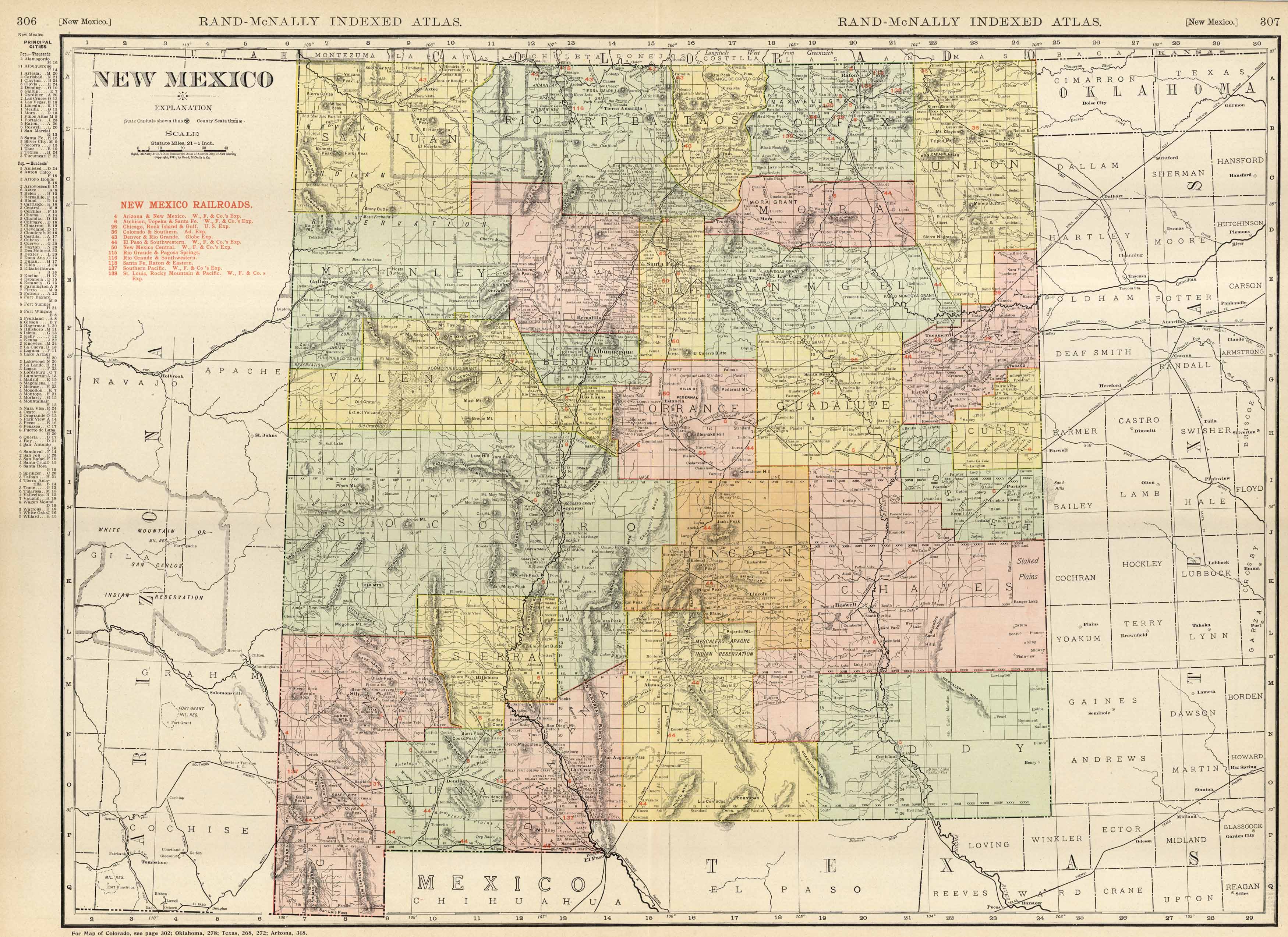 This map of New Mexico was produced by Rand McNally and Co. as part of its Commercial Atlas of America. These maps are some of our favorite maps because of the large size of each map sheet (25.5”x20.5”). The detail shown on each map is exceptional because of the map size. These maps were intended to be used by business for shipping and other uses. Roads, railroads, and rivers are clearly shown. There is more detail on these maps than any others during this time period.