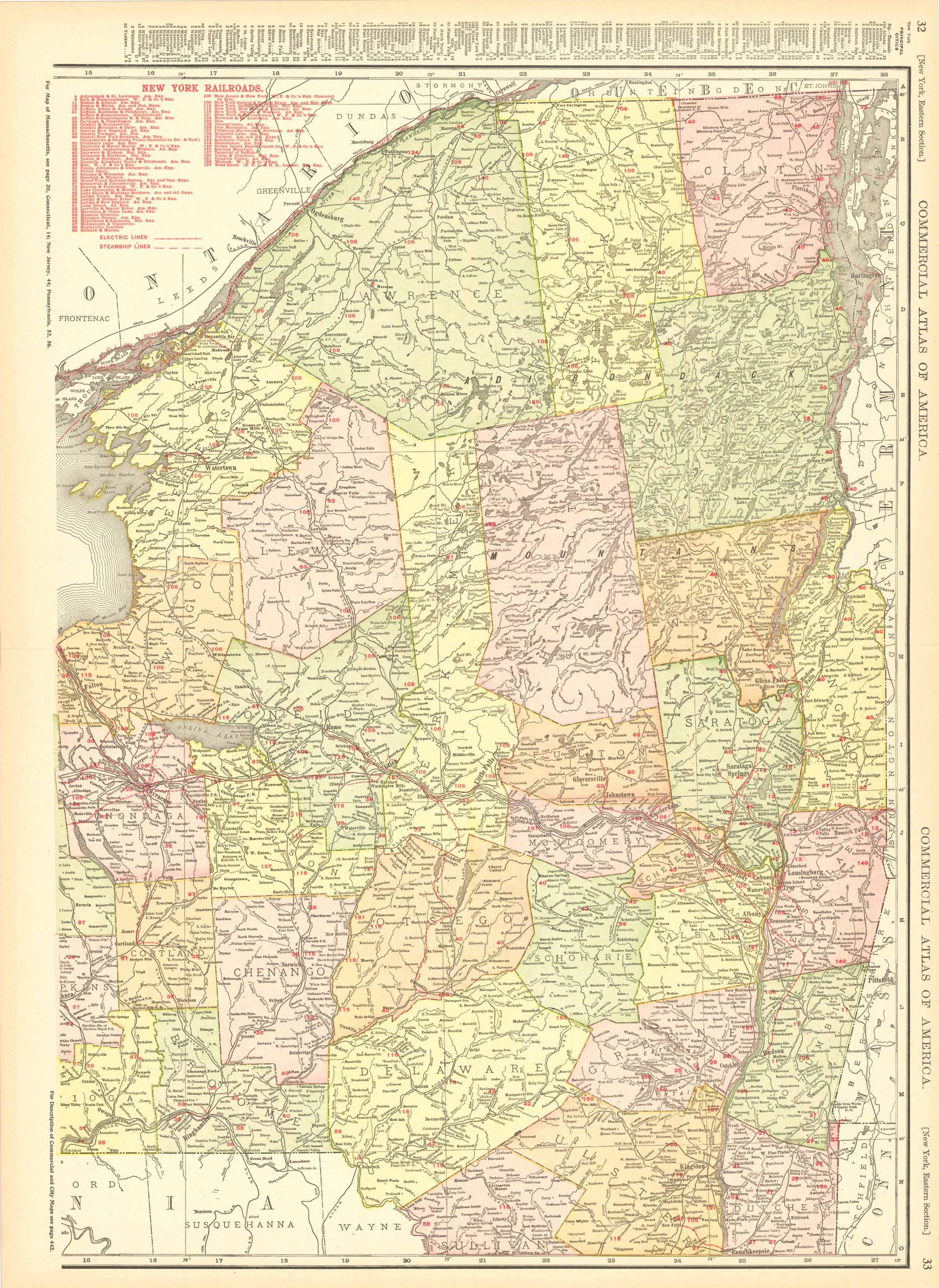 This map of New York Eastern Section was produced by Rand McNally and Co. as part of its Commercial Atlas of America. These maps are some of our favorite maps because of the large size of each map. The detail shown on each map is exceptional because of the map size. These maps were intended to be used by business for shipping and other uses. Roads, railroads, rivers, and buildings are clearly shown. There is more detail on these maps than any others during this time period.