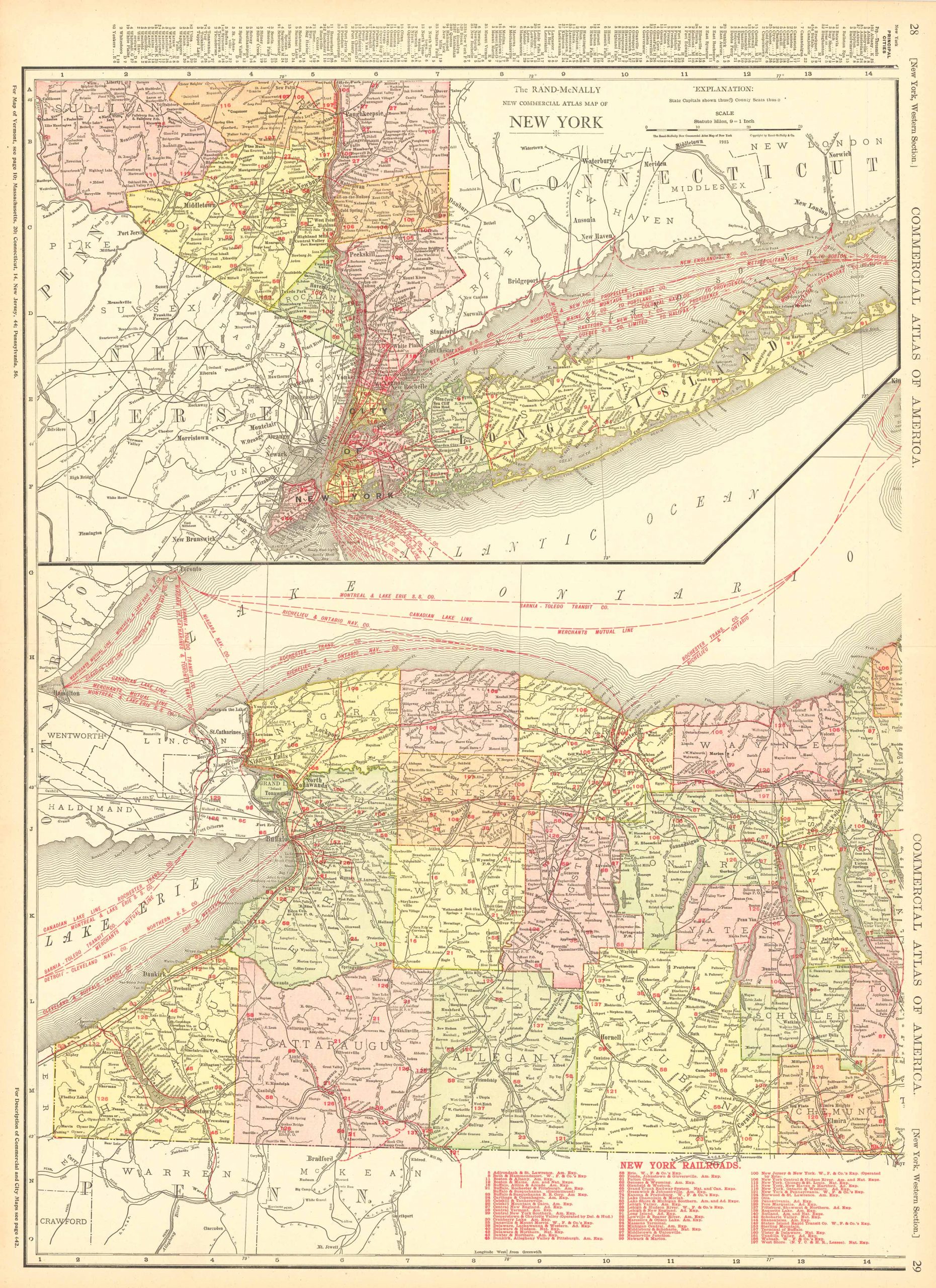This map of New York was produced by Rand McNally and Co. as part of its Commercial Atlas of America. These maps are some of our favorite maps because of the large size of each map. The detail shown on each map is exceptional because of the map size. These maps were intended to be used by business for shipping and other uses. Roads, railroads, rivers, and buildings are clearly shown. There is more detail on these maps than any others during this time period.