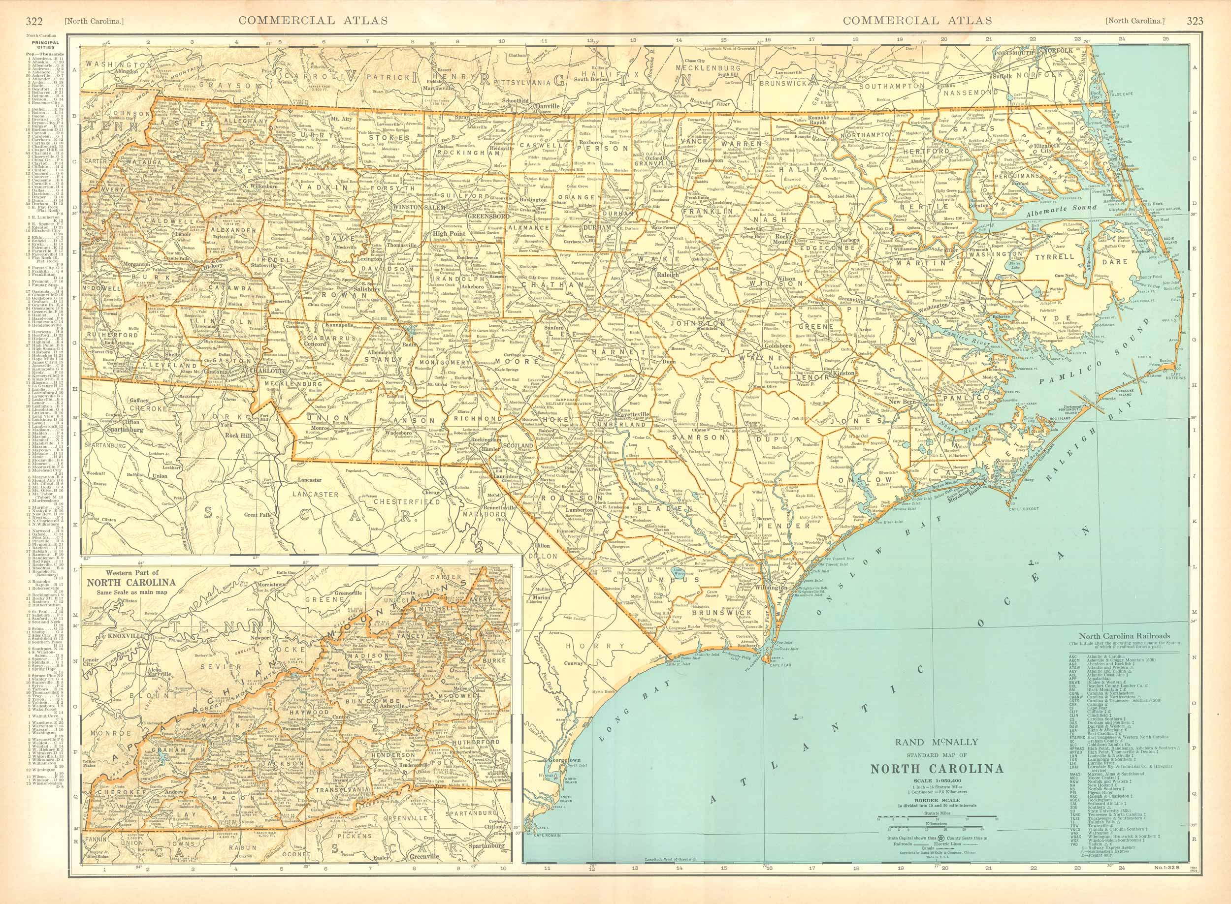 Rand McNally & Company, still a major name in map publishing to this day, began as a small print shop opened in Chicago in 1856 by William H. Rand. The shop originally printed guidebooks and directories. In 1858, Rand hired Andrew McNally who was later to become a partner. Within the next few years, the shop got into the railroad business by starting to print railway tickets and schedules, a key step in the development of the company. The ticket printing led to the publishing of railway guides, and by 1872 Rand McNally and Company had the capacity to publish maps. This map of North Carolina came from Rand McNally’s Commercial Atlas. A highly successful run of atlases that lasted over a decade. These maps were primarily used by business, because of their accurate listing of railroads in operation as well as tables of statistical information. This map is unique in several ways, their large format makes an impressive display, and offers additional room where many small towns and extra details are included. Additionally a list of every railroad operating in the state in 1932 is included. All railroad routes are shown on the map. This map includes all cities and towns, lakes, rivers, and bodies of water. All topographical features are also included as well as political features such as counties and Native American Indian reservations.