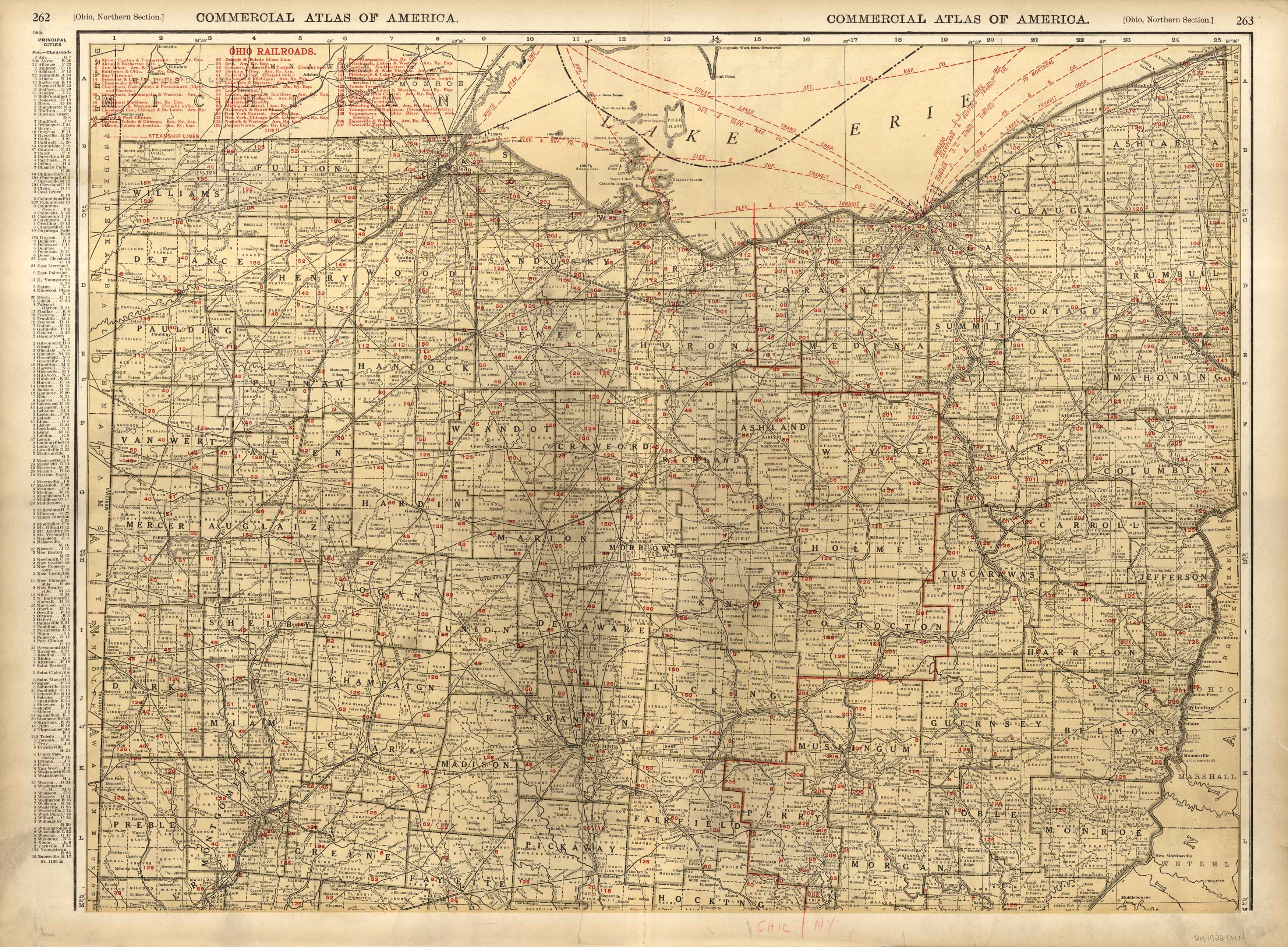 This map of Ohio was produced by Rand McNally and Co. as part of its Commercial Atlas of America. The detail shown on each map is exceptional because of the map size. These maps were intended to be used by business for shipping, etc. Roads, railroads, and rivers are clearly shown. There is more detail on these maps than any others during this time period.