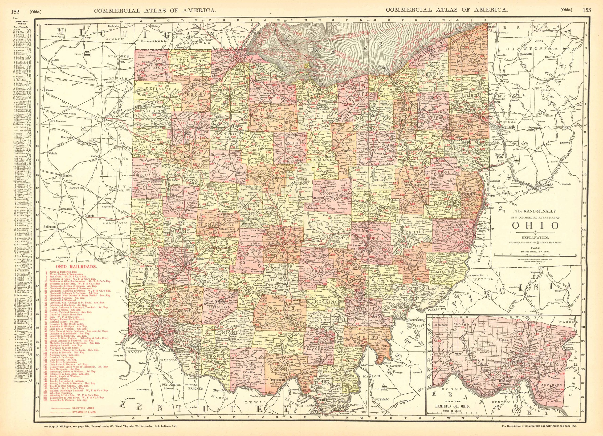 This map of Ohio was produced by Rand McNally and Co. as part of its Commercial Atlas of America. These maps are some of our favorite maps because of the large size of each map. The detail shown on each map is exceptional because of the map size. These maps were intended to be used by business for shipping and other uses. Roads, railroads, rivers, and buildings are clearly shown. There is more detail on these maps than any others during this time period.