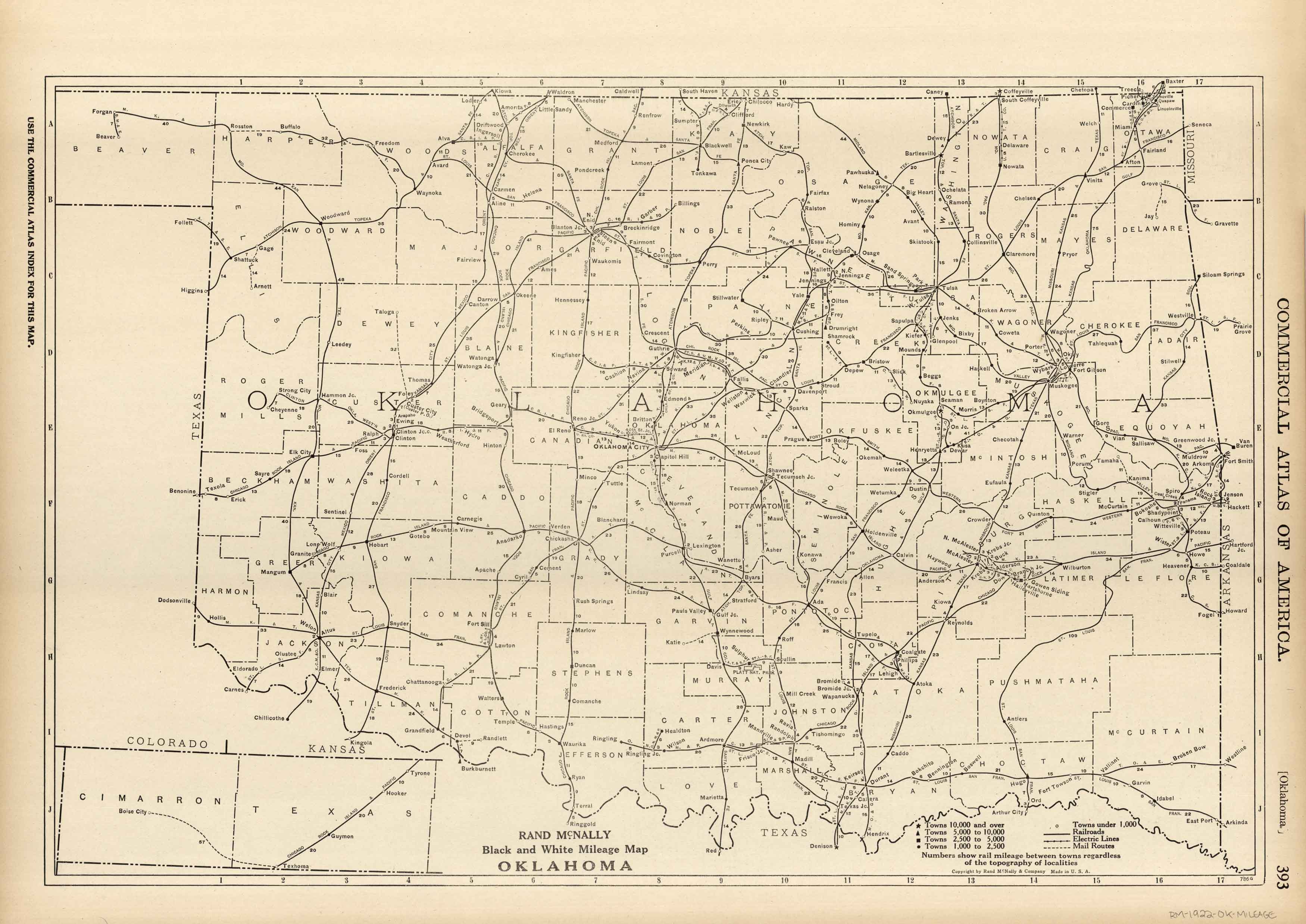 This map of Oklahoma was produced by Rand McNally and Co. as part of its Commercial Atlas of America. The detail shown on each map is exceptional because of the map size. These maps were intended to be used by business for shipping, etc. Roads, railroads, and rivers are clearly shown. There is more detail on these maps than any others during this time period.
