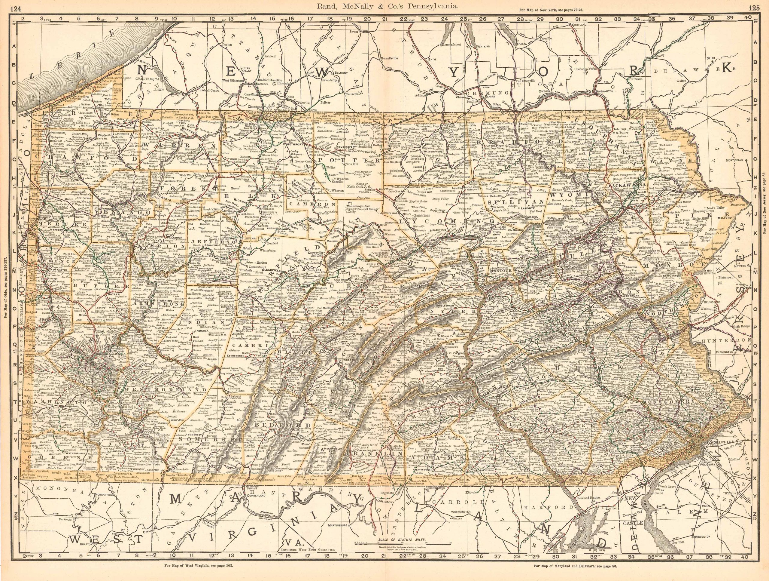 We are proud to offer this map of Pennsylvania, originally produced as part of Rand McNally’s Enlarged Business Atlas dated 1891. Although the table of contents shows different editions starting in 1885, we believe this is the first edition of the Enlarged Atlas. Each of these maps accurately locates all cities, towns, post offices, railroad stations, villages, counties, parishes, islands, lakes, rivers, mountains and more. Until McNally’s enlarged Business Atlas, maps had never been produced that provided as much information as these do. Even today, we use these 130 year old maps to locate small towns, villages, and railroad routes that are no more.
