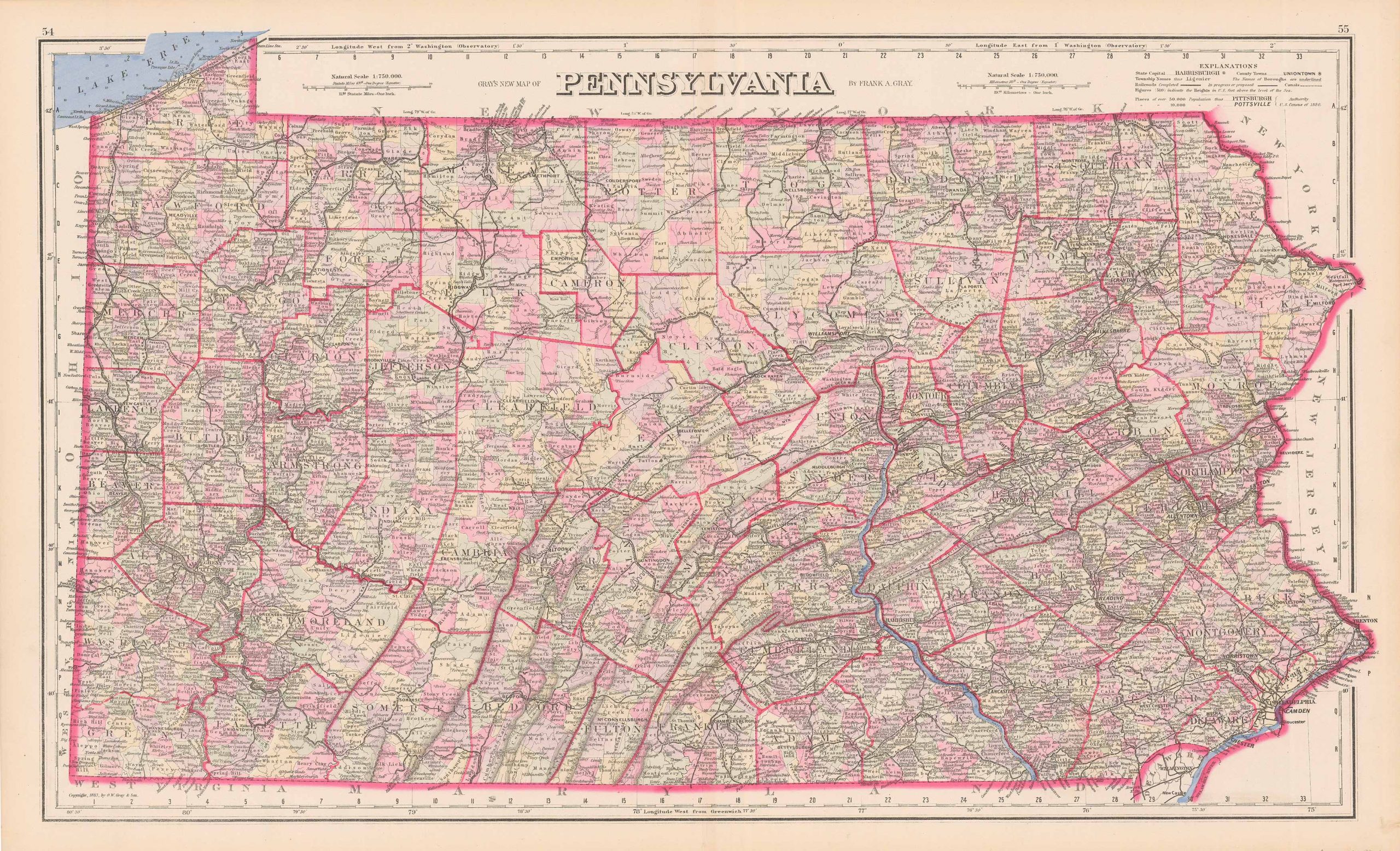This antique map of Pennsylvania was produced by O.W. Gray as part of his “National Atlas” in 1884. Gray was involved in the production of Atlas’ from ca. 1871 – 1886. We love his maps because of the wonderful hand coloring and attention to detail.