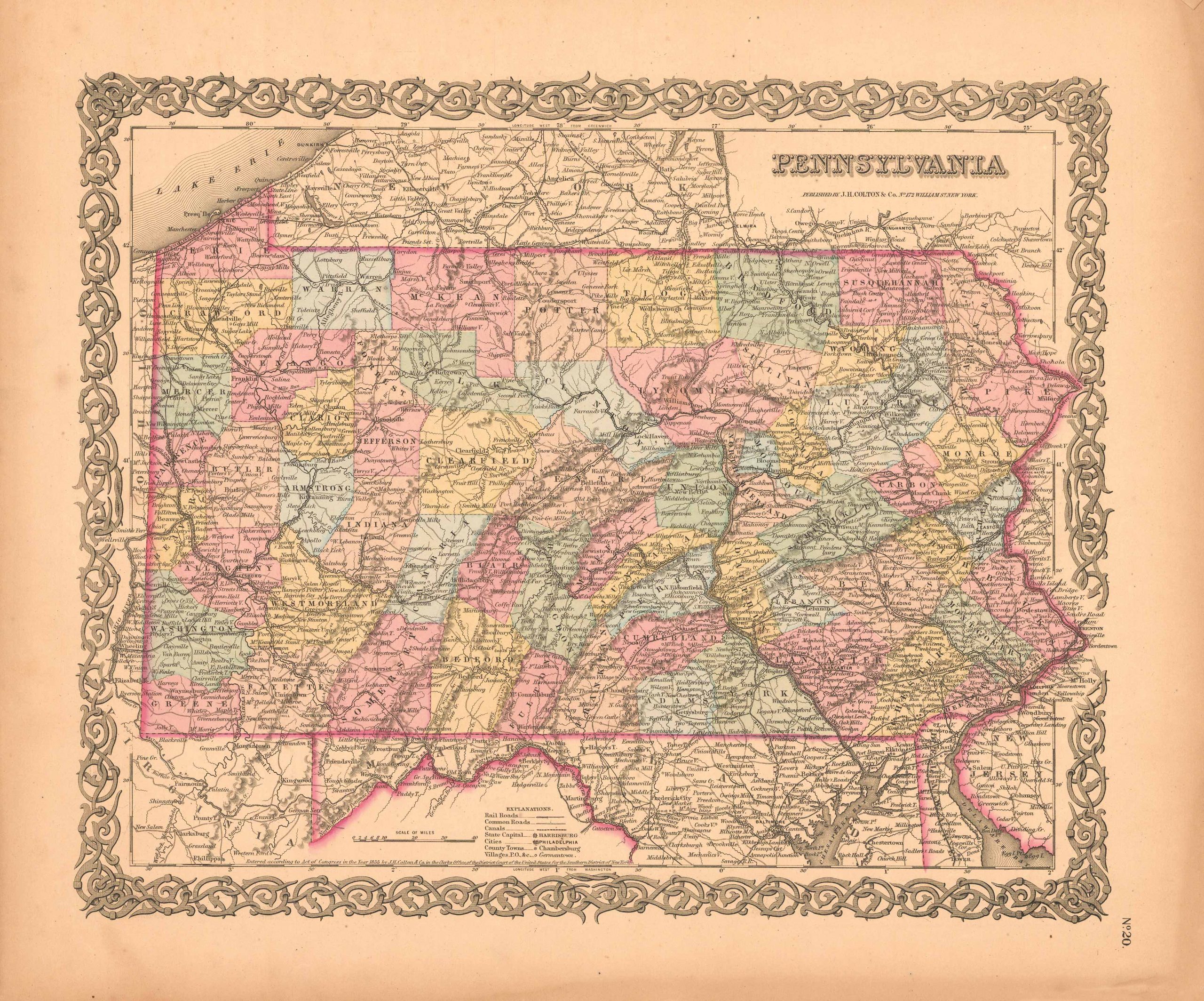 Art Source International is proud to offer this map of Pennsylvania from the 1856 edition of Coltons Atlas of the World. Colton atlases, especially those from the 1850’s, have become increasingly rare. The Colton maps were engraved by steel plates rather than by wax engraving, which was the most common method used at this time. These maps are very detailed in beautiful hand colored pastels, and feature Colton’s signature 3/4 inch border. This map shows cities, towns and villages, transportation routes, common roads, canals, rivers and lakes, and other geographical features.