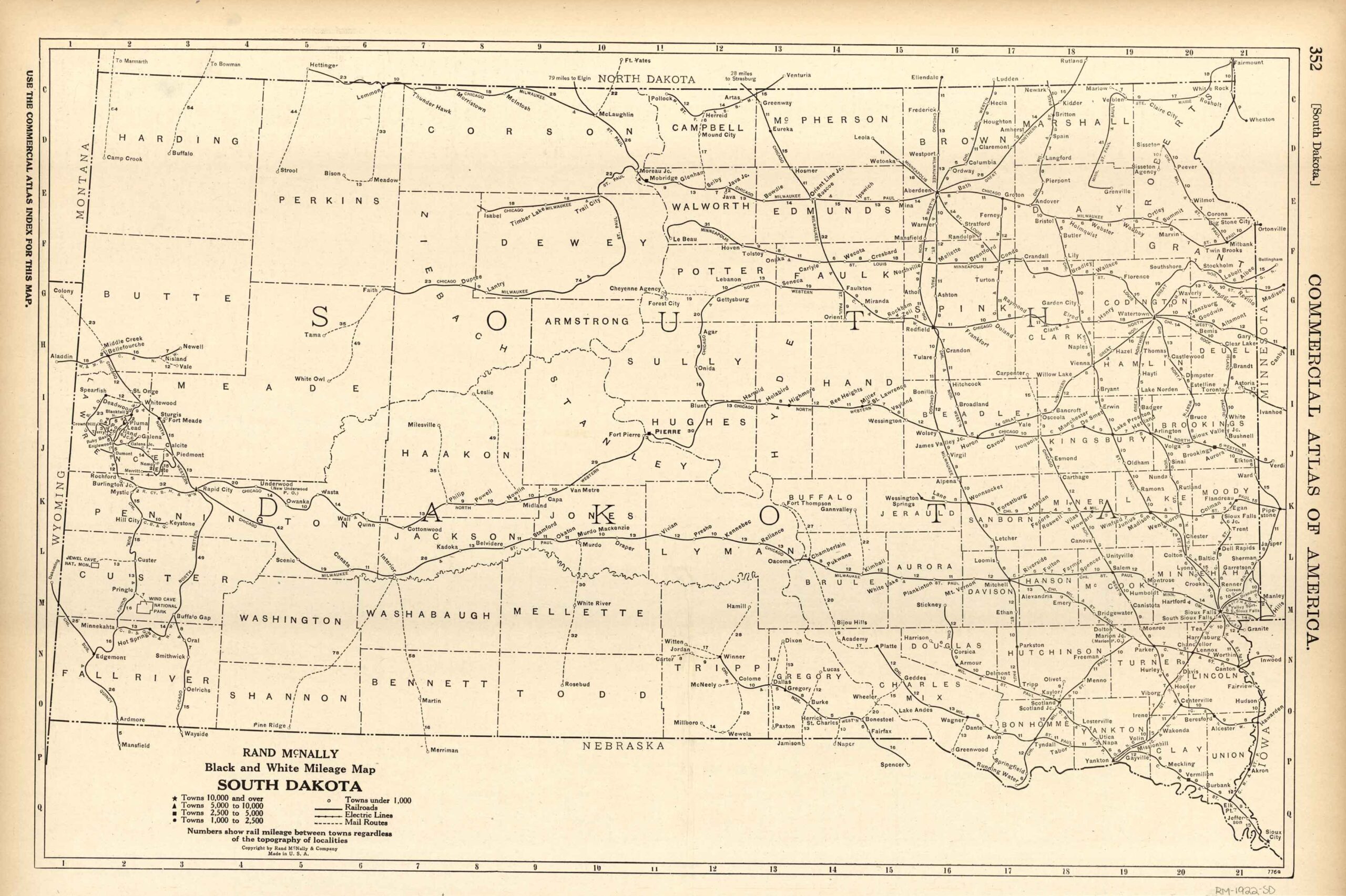 This map of South Dakota was produced by Rand McNally and Co. as part of its Commercial Atlas of America. The detail shown on each map is exceptional because of the map size. These maps were intended to be used by business for shipping, etc. Roads, railroads, and rivers are clearly shown. There is more detail on these maps than any others during this time period.