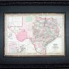 This is a majestic framed piece that depicts Texas during the height of the Civil War era. As the strife raged throughout the southeast of this nation, we see Texas expanding and growing rapidly west. Here we see counties blossoming across the eastern half of the state, each of them distinctly hand colored, as the west is divided into the four enormous counties, “Presidio”, “El Paso”, “Bexar”, and one unnamed territory reaching into the panhandle. Throughout the map we see incredible detail not just for topography, and hydrography, but also towns, railroads, and even wagon roads. Three insets show us Sabine Lake, Galveston Bay, and the Texas panhandle. Surrounded by a decorative border, this beautiful map is typical of Johnsons excellent sense of presentation, as well as outstanding cartography. Condition is good with minimal supportive. This rare item is handsomely framed with all archival precautions taken. Framed with inner mat, marbleized paper, inner liner, cloth mat, UV protective glass and ornate dark wood frame.
