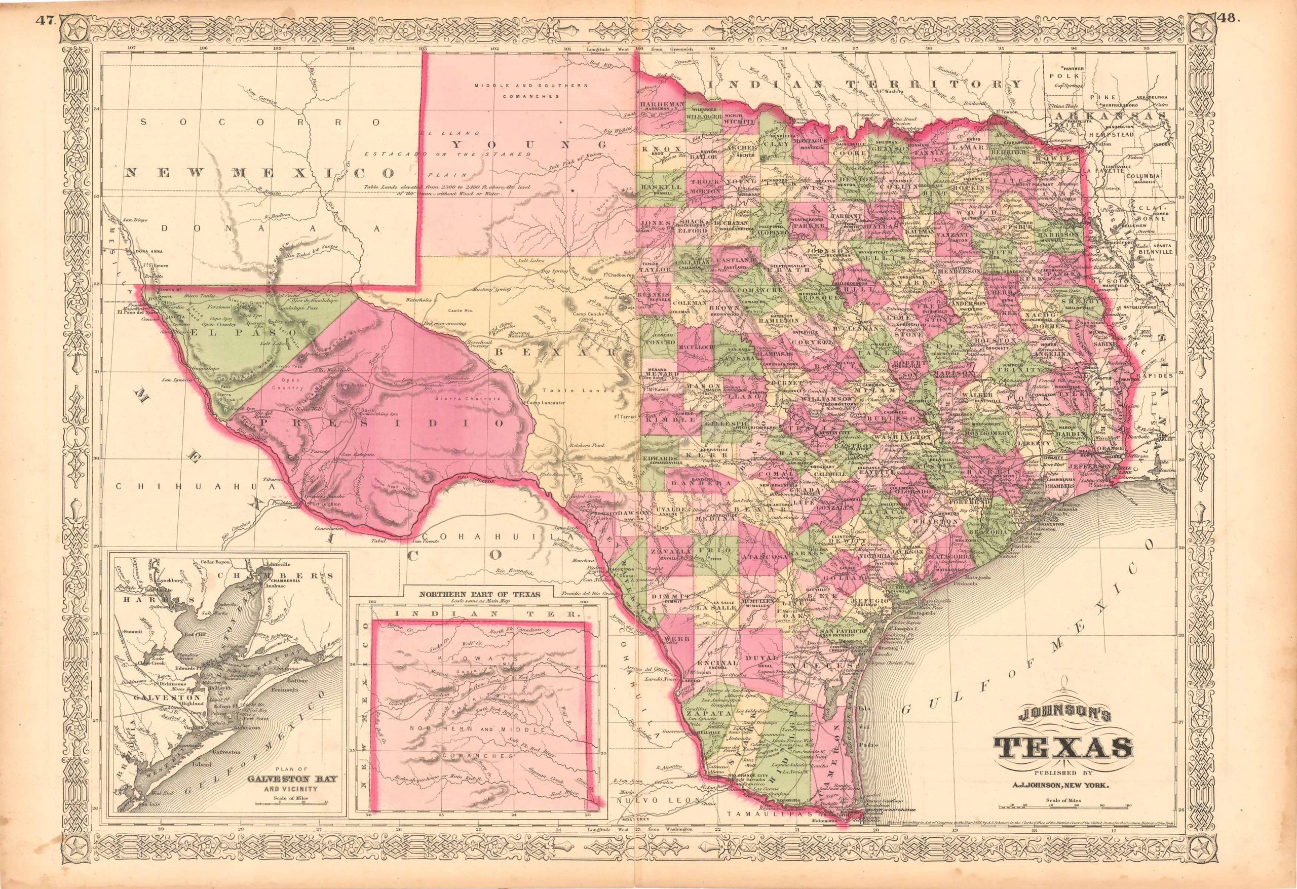 This antique map came from Johnsons New Illustrated (Steel Plate) Family Atlas, published in 1867, by A.J. Johnson. These maps are some of the most colorful and accurate maps produced in the 1860’s, their attention to detail and the fine steel engraving make them works of art. Johnson maps are characterized by hand coloring in red, green, yellow, and pink and distinctive borders, including iron scrollwork and a Celtic design. This beautiful map of the State of Texas shows counties, cities and towns, lakes, rivers, and water bodies, mountains, railroads, forts, and wagon trails. A fine piece that would make a nice addition to any wall in a home or office. Also shows inset maps of Northern Part of Texas and a Plan of Galveston Bay and Vicinity.